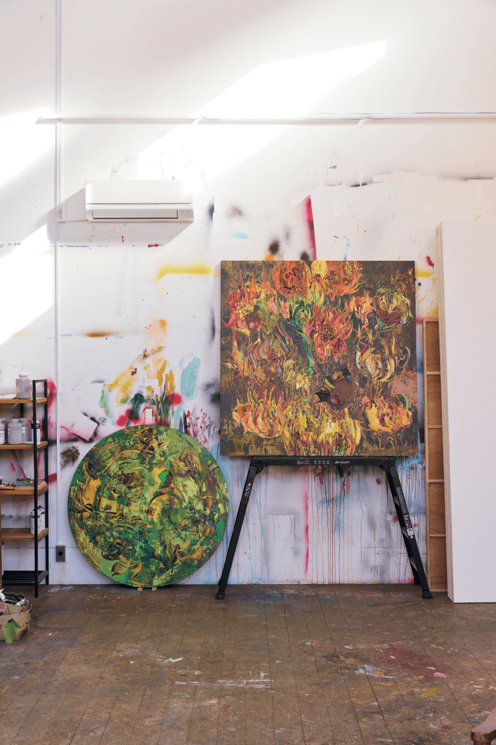 Right: ‘flower of life – in the style of van Gogh #7’, 2024. Oil, wood panel, acrylic, resin, UV print – 145.5 × 145.5 cm. On the right, a tribute to Van Gogh’s ‘Sunflowers’. On the left, a work in progress from the ‘flower of life’ series.