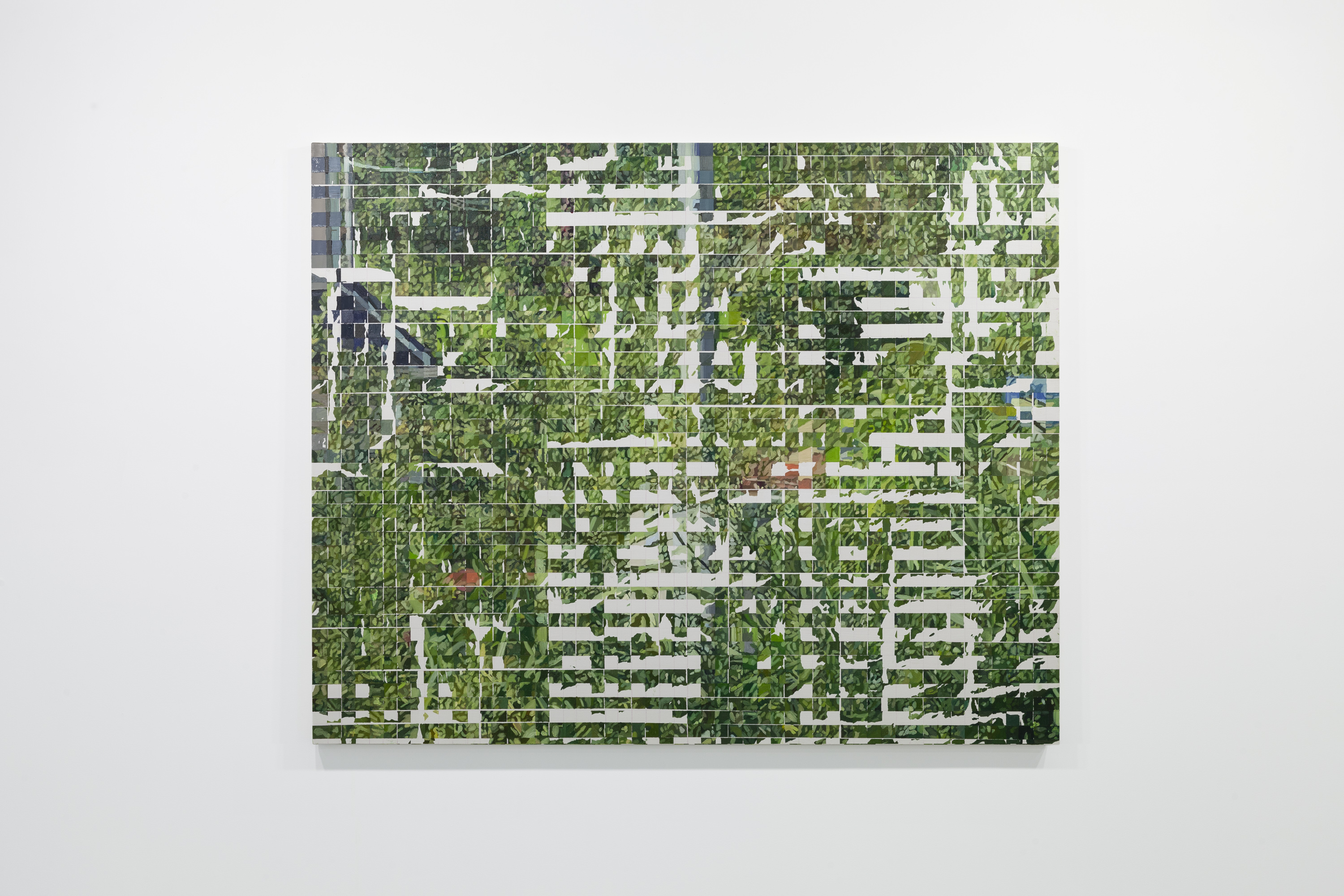 The artist, born in Oita Prefecture in 1994 and the recipient of the Wasaku Kobayashi Encouragement Prize in 2018, always goes through the same process: on a photograph, she makes 3 x 3-cm squares using masking tape. She then uses paint to reproduce these squares on a canvas, one after the other—the adjacent square is therefore hidden when the paint is applied. Thus, the masking tape is stuck and removed several times, causing the image to deteriorate gradually, in an allegory of the loss of memory that is already fragmented. The artist’s inspirations include photographs found in family archives or that she took herself, like one of an unusual house spotted while on a walk, the edges of which fade into the surrounding vegetation.