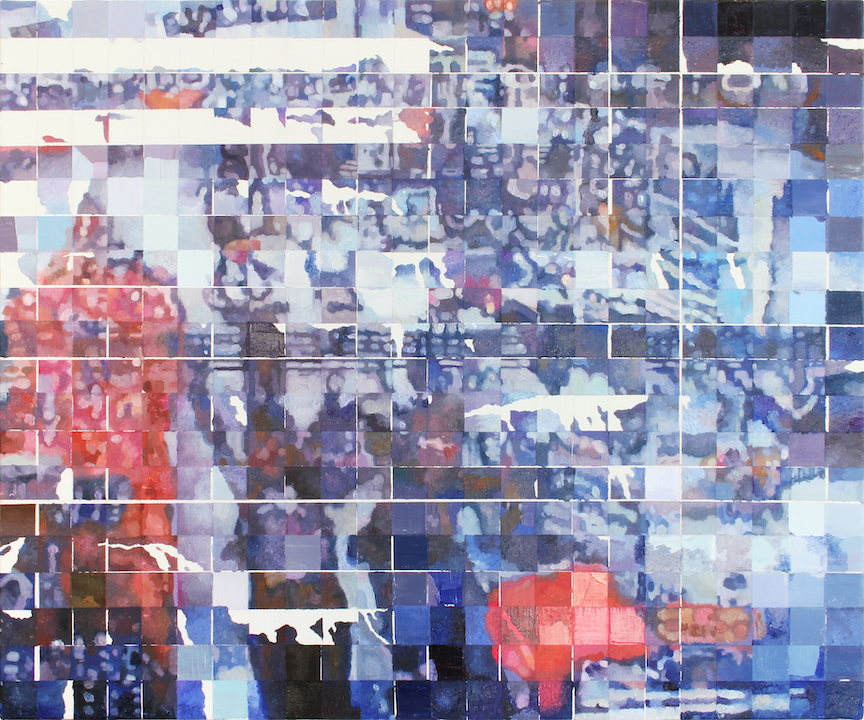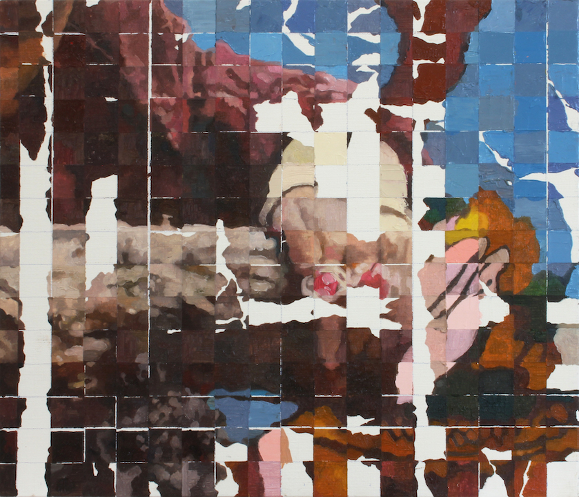 Fragments of memory, centimetre by centimetre. Somewhere between Seurat’s pointillism and Invader’s mosaics, Shiori Tono draws a grid over printed photographs as if to retrieve a partially lost memory, before transferring the image onto canvas, square by square.