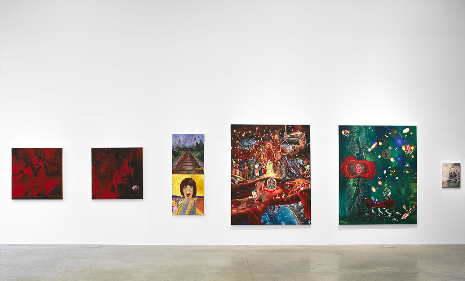 In these colourful and cluttered paintings, mysterious landscapes teem with aliens, monsters, and the occasional human.