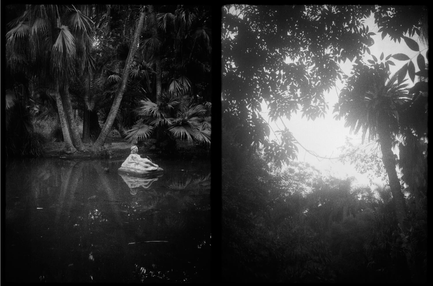 A statue in a pond and sky seen through palm trees. Botanical Garden of Hamma, Algiers, Algeria ©Tomoko Yoneda, courtesy of ShugoArts