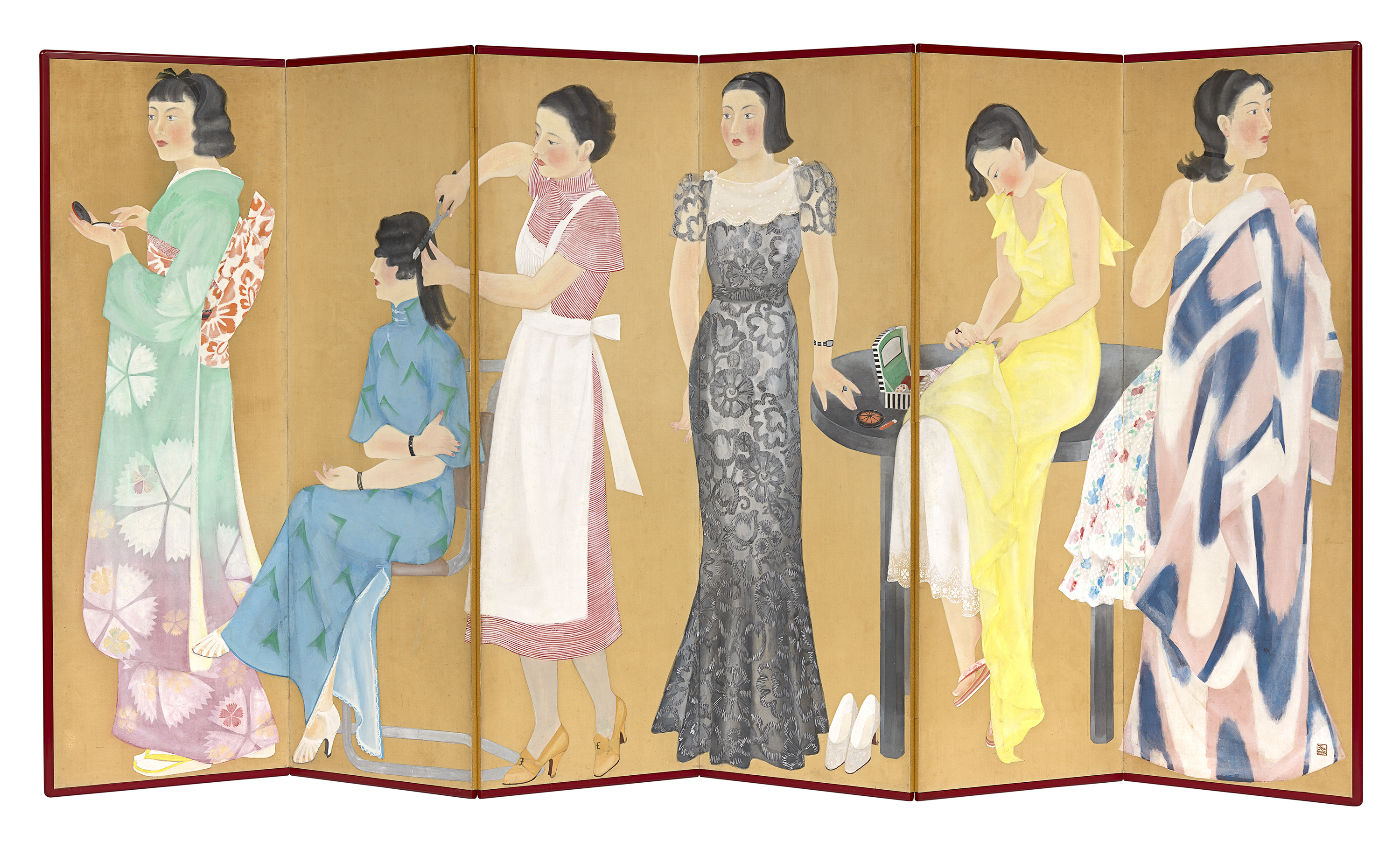Taniguchi Fumie, ‘Preparing to go out’, 1935, six-panel folding screen: ink and watercolour on silk, lacquer on wood, National Gallery of Victoria, Melbourne, Kevin McDonald and Eunice McDonald Bequest and NGV Foundation, 2019 © Estate of Taniguchi Fumie