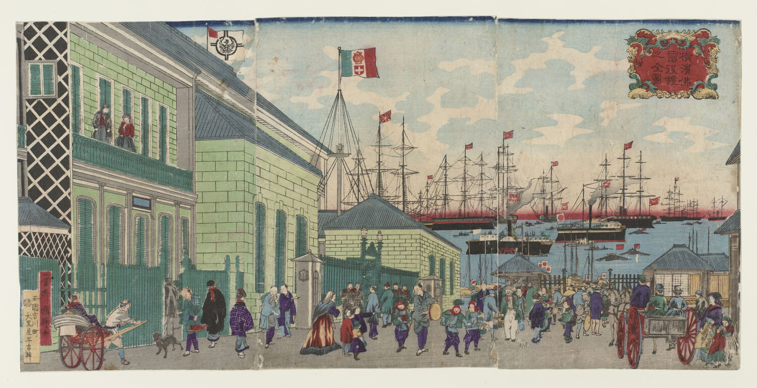 Kuniteru Utagawa, “Vue d'ensemble du quartier français de Yokohama” (estampe), 1872. © RMN-GP (MNAAG, Paris) / Thierry Ollivier