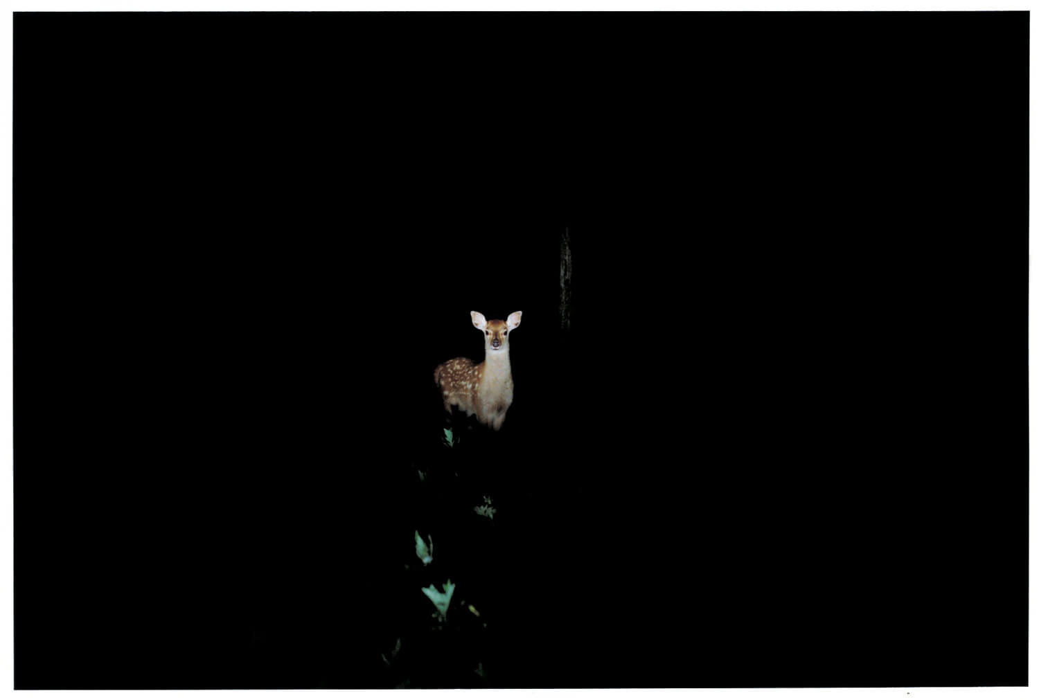 A single mysterious photograph of a deer that suddenly appeared after the photographer decided to give up looking for deer that evening. The deer’s glance somehow makes you strongly aware of the boundary between our world and the darkness in the background. Courtesy of the artist and GALLERY SIDE 2