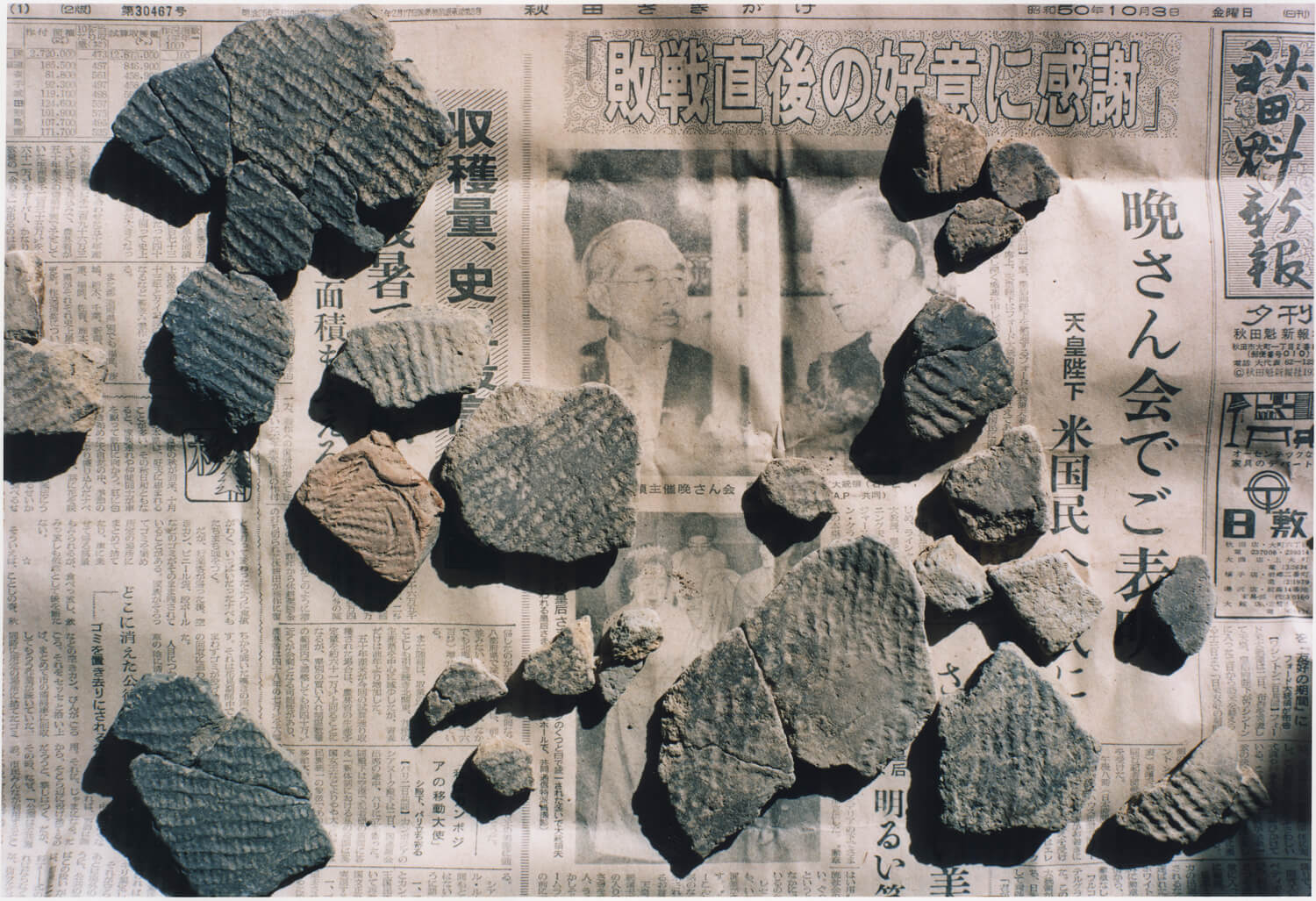 A picture of a fragment of an earthenware pot from the Jomon period preserved as a historical artifact. The ancient earthenware fragment and the modern newspaper spread beneath it were photographed with Tatsuki’s Method, showing us these multiple layers of time. Courtesy of the artist and GALLERY SIDE 2