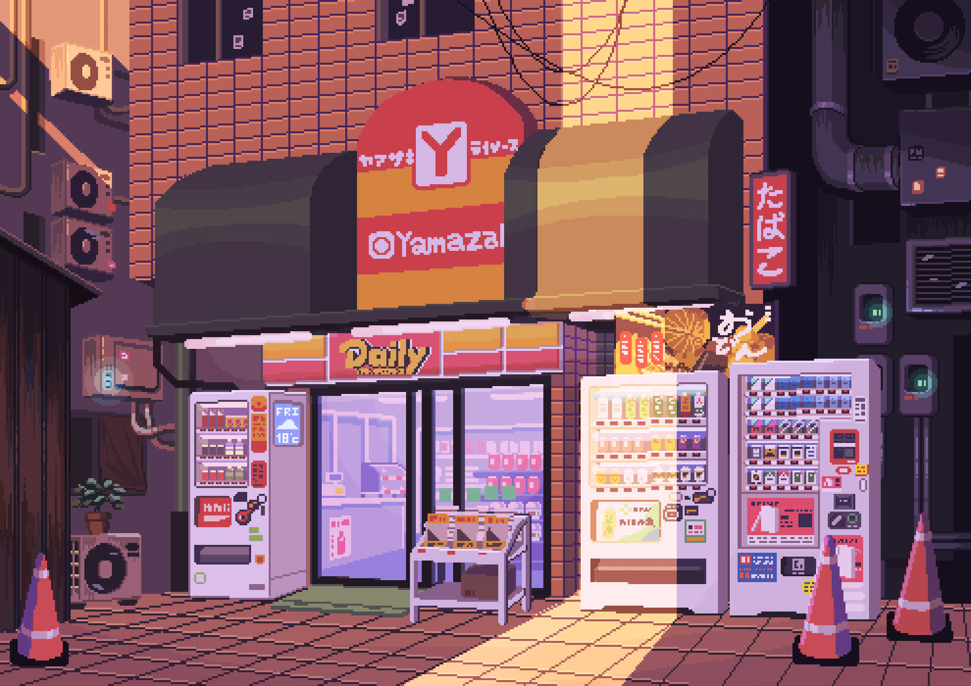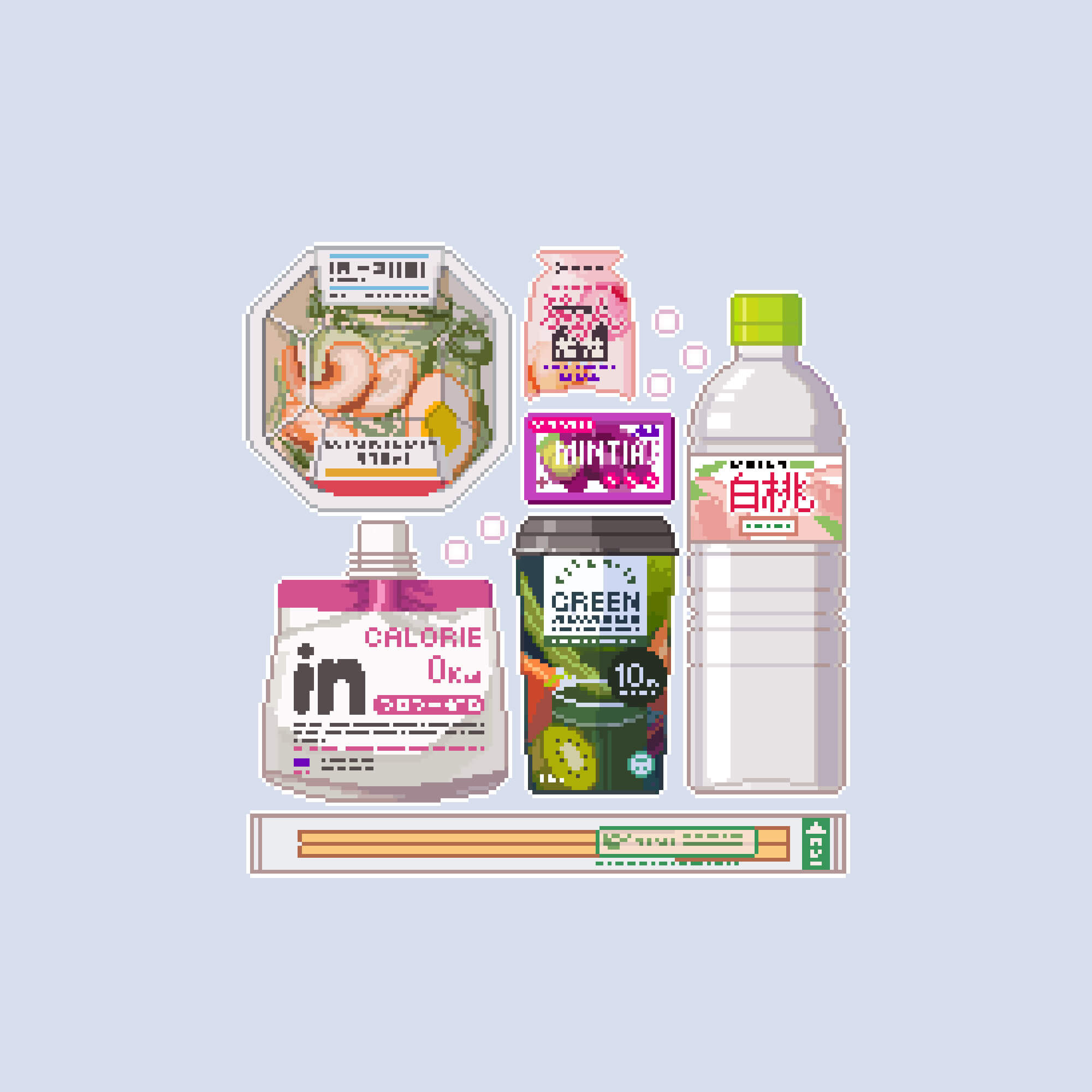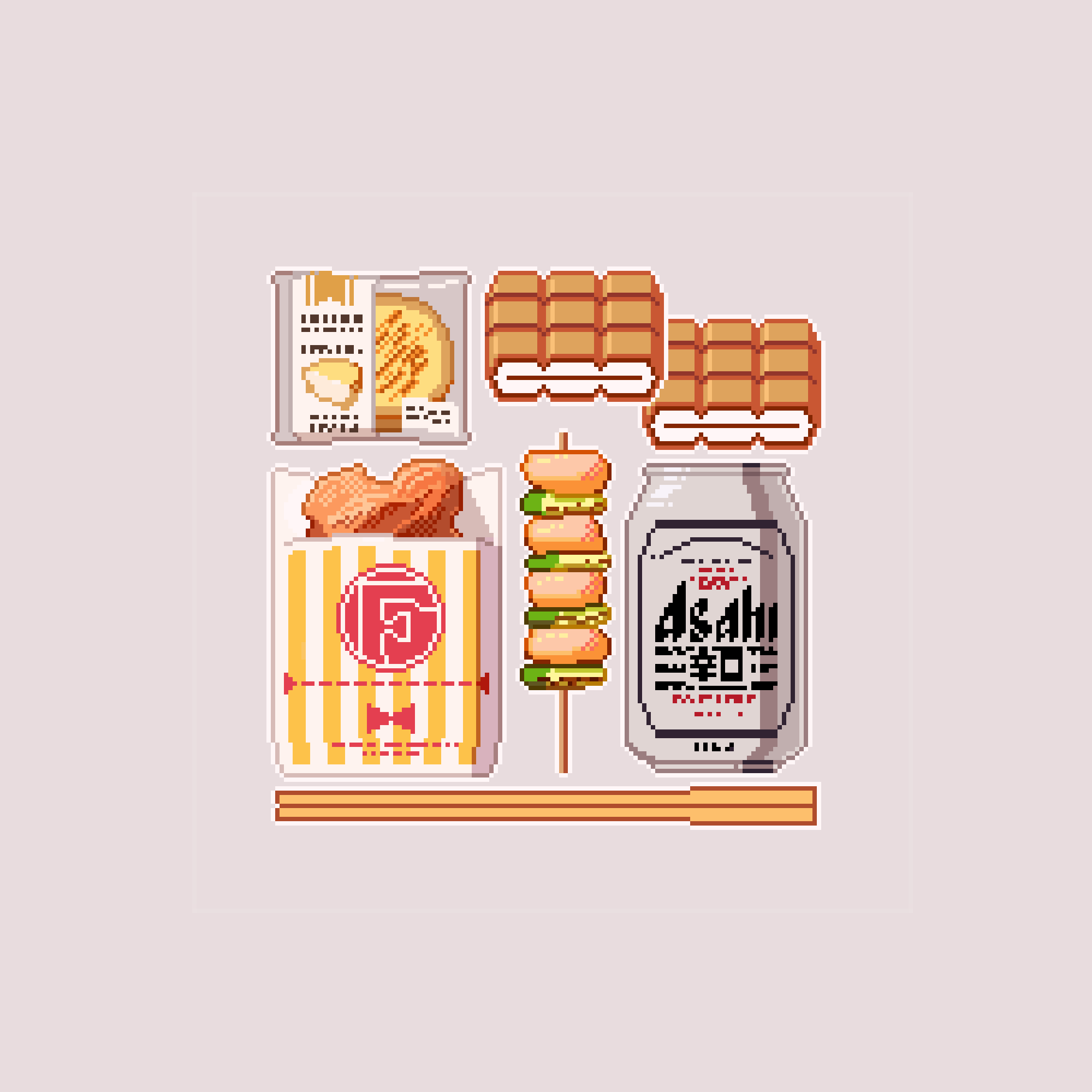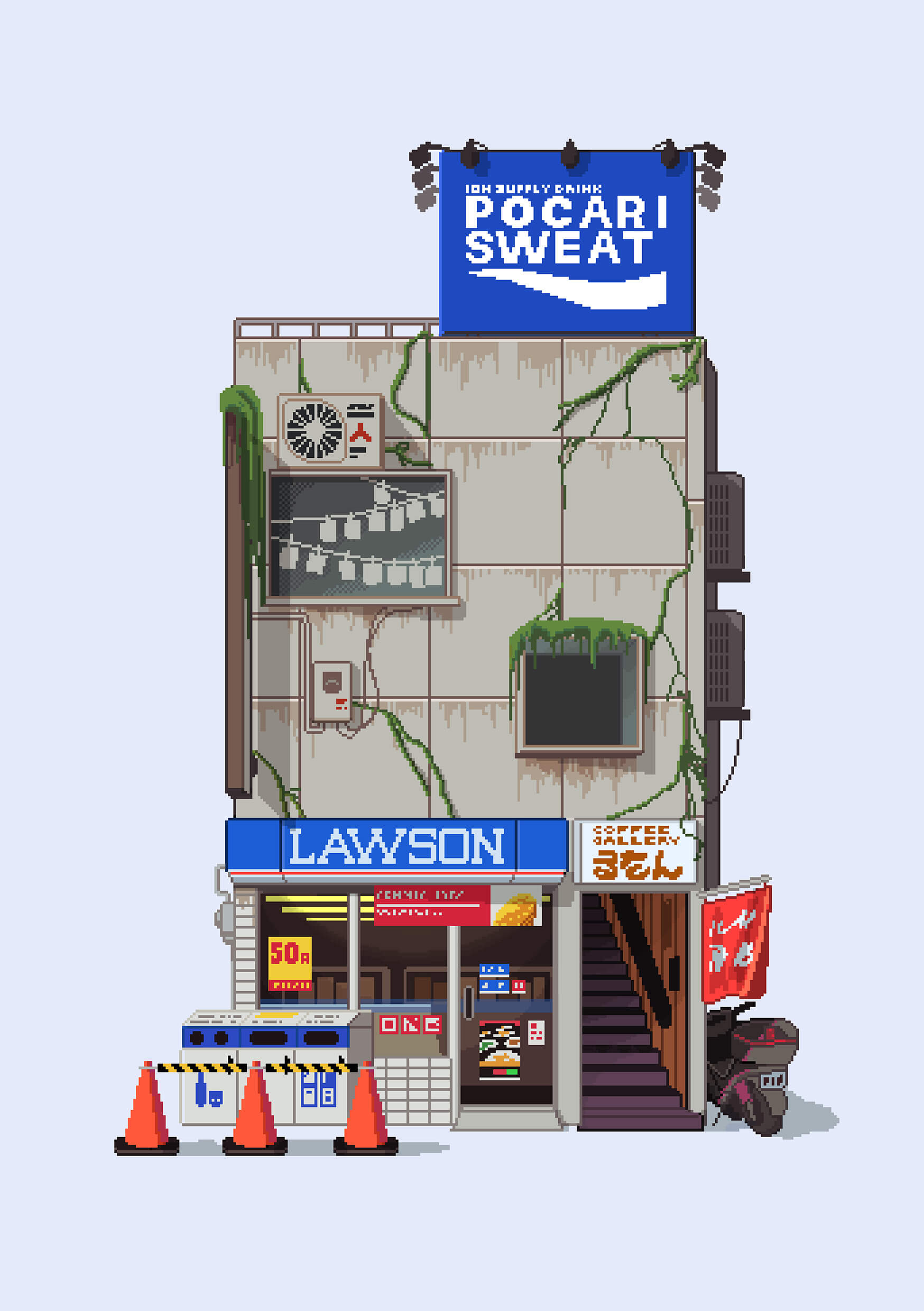 The artist, who hopes one day to direct a short film entirely in pixels, has also compiled other Japanese miscellanea in the series Pixel Art: Prop Concepts, in which he reproduces equally iconic Japanese items: vending machines, bowls of ramen, and flagship products found in konbini.