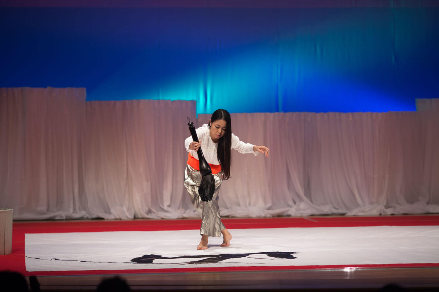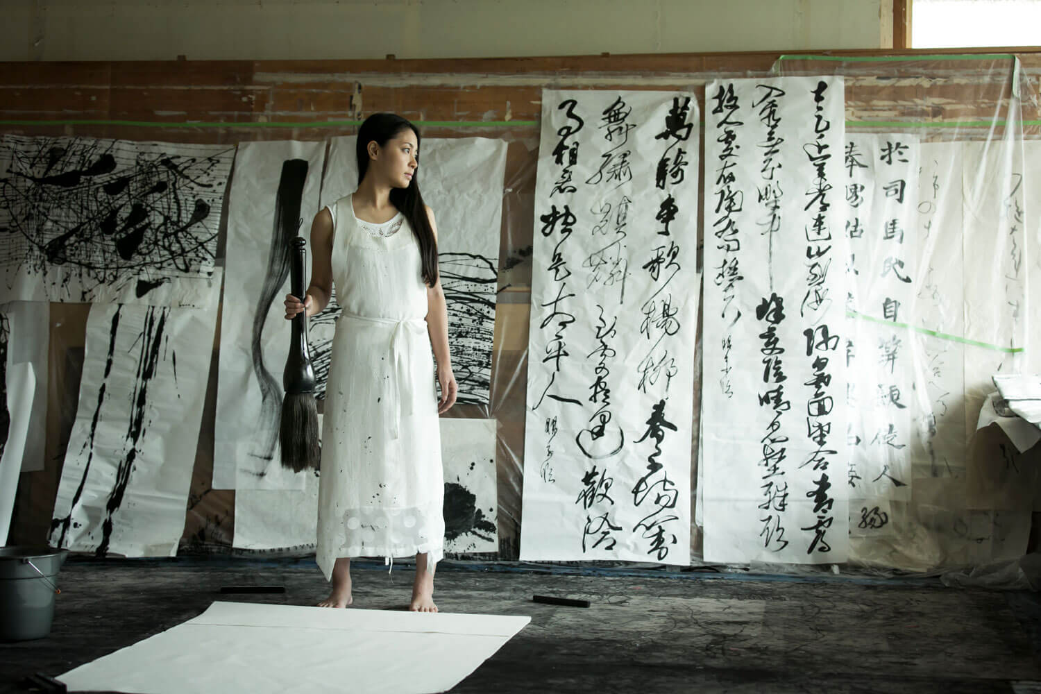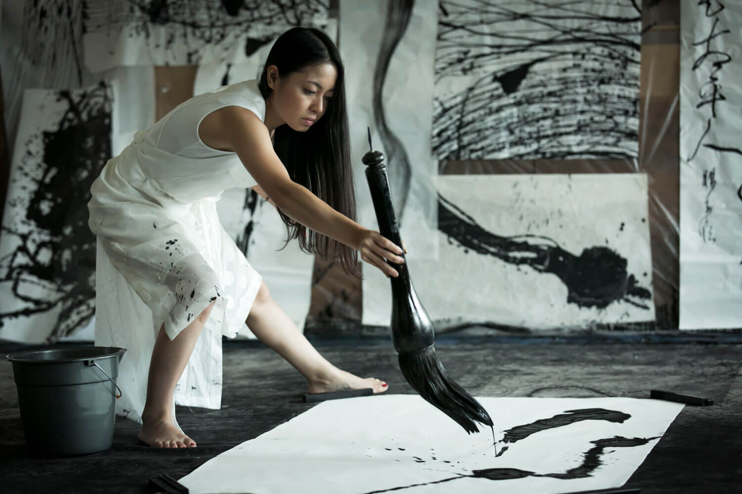 Silently, she bows to the canvas, which is several square metres in size, picks up a brush (of equally extraordinary dimensions), dips it in a well of ink and lets the excess flow off ceremoniously. Suddenly, she rushes forward and runs the brush over the gigantic canvas, stops, her body fully extended, as the brush fibres drip ink onto the canvas, before returning to the source and, having recharged her ammunition, starting the process again.