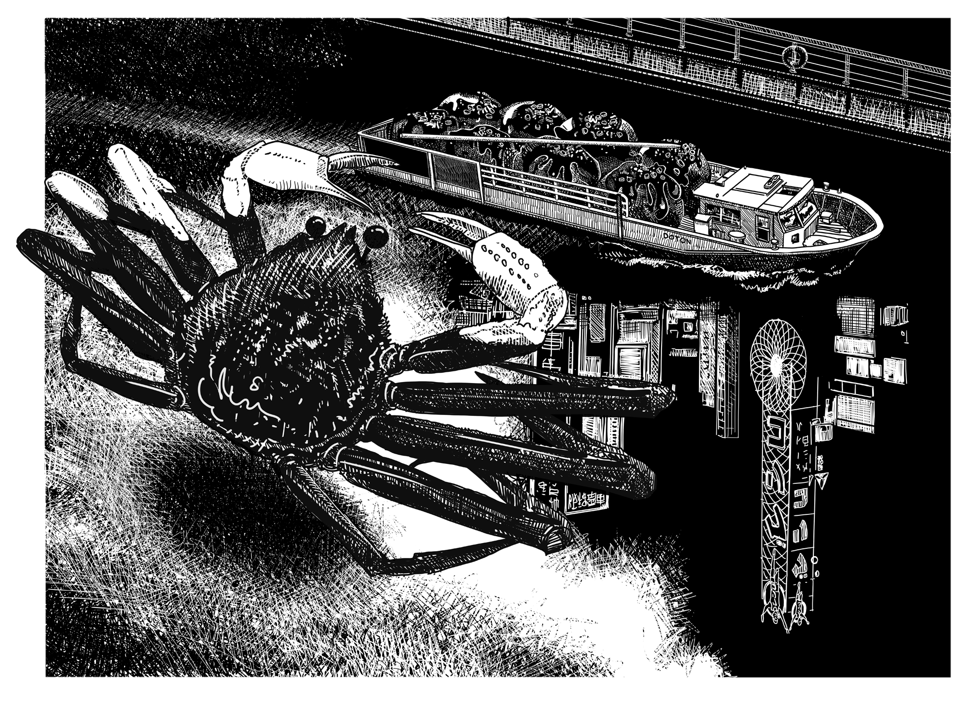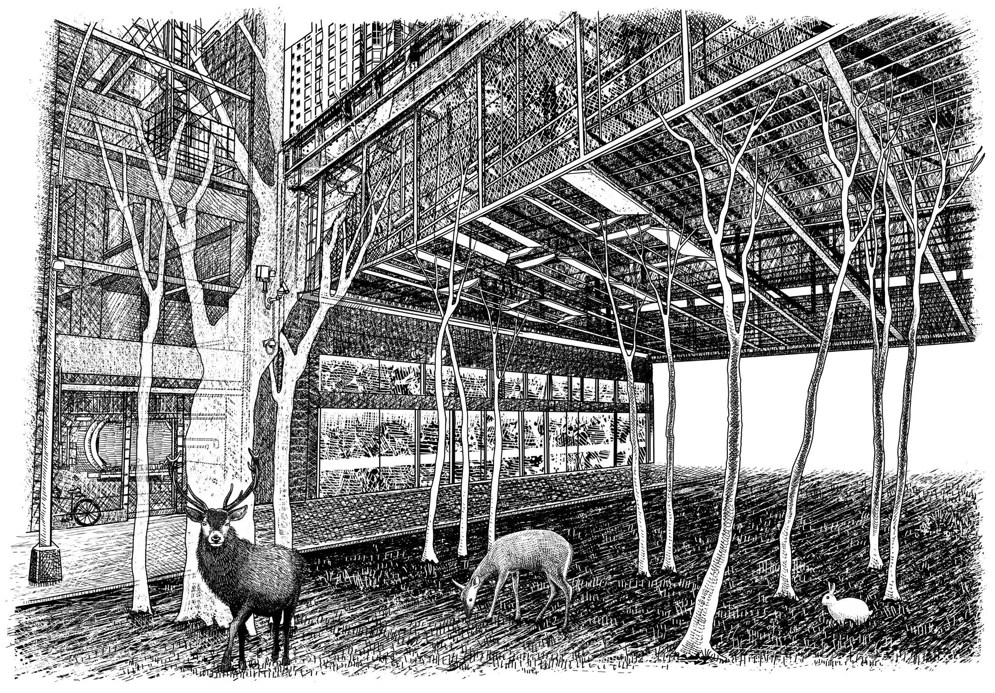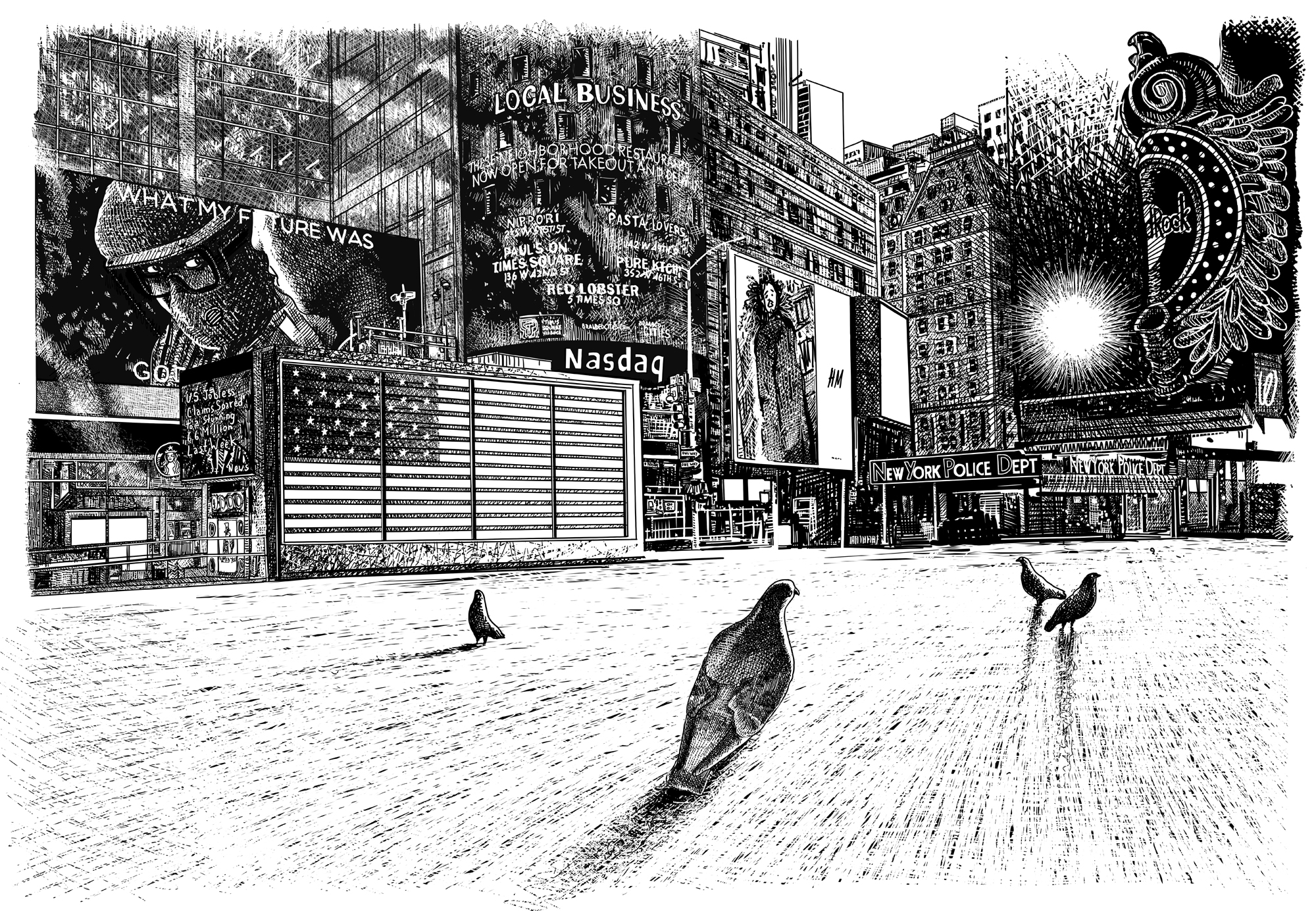 Deer roam in the middle of 9th Avenue in New York City in search of food, sadly echoing those without shelter, who are now more lonely than ever. Pigeons have taken over Times Square, in front of the huge advertising billboards, still illuminated. An incredibly large crab, straight from Osaka, even pays homage to the city for its street food eaten on the go. In this timeless context, it is finally possible to take a step back from our usual living conditions. Ecological, agro-alimentary, industrial, and capitalist deviations are more visible than ever. Drawing is a way of atoning for these contradictions, of denouncing them publicly, as much as it is a method of personal maturation.