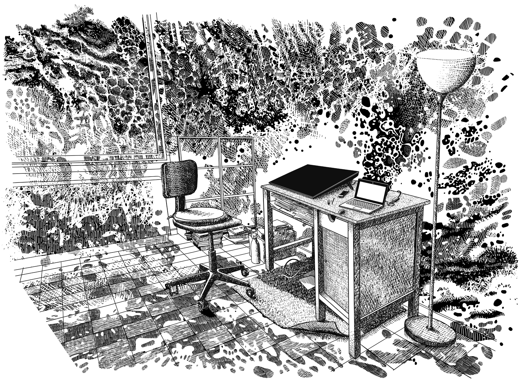 No more trips, no more journeys. Confined to his home, the artist began a series of drawings that retrace his daily life under lockdown.