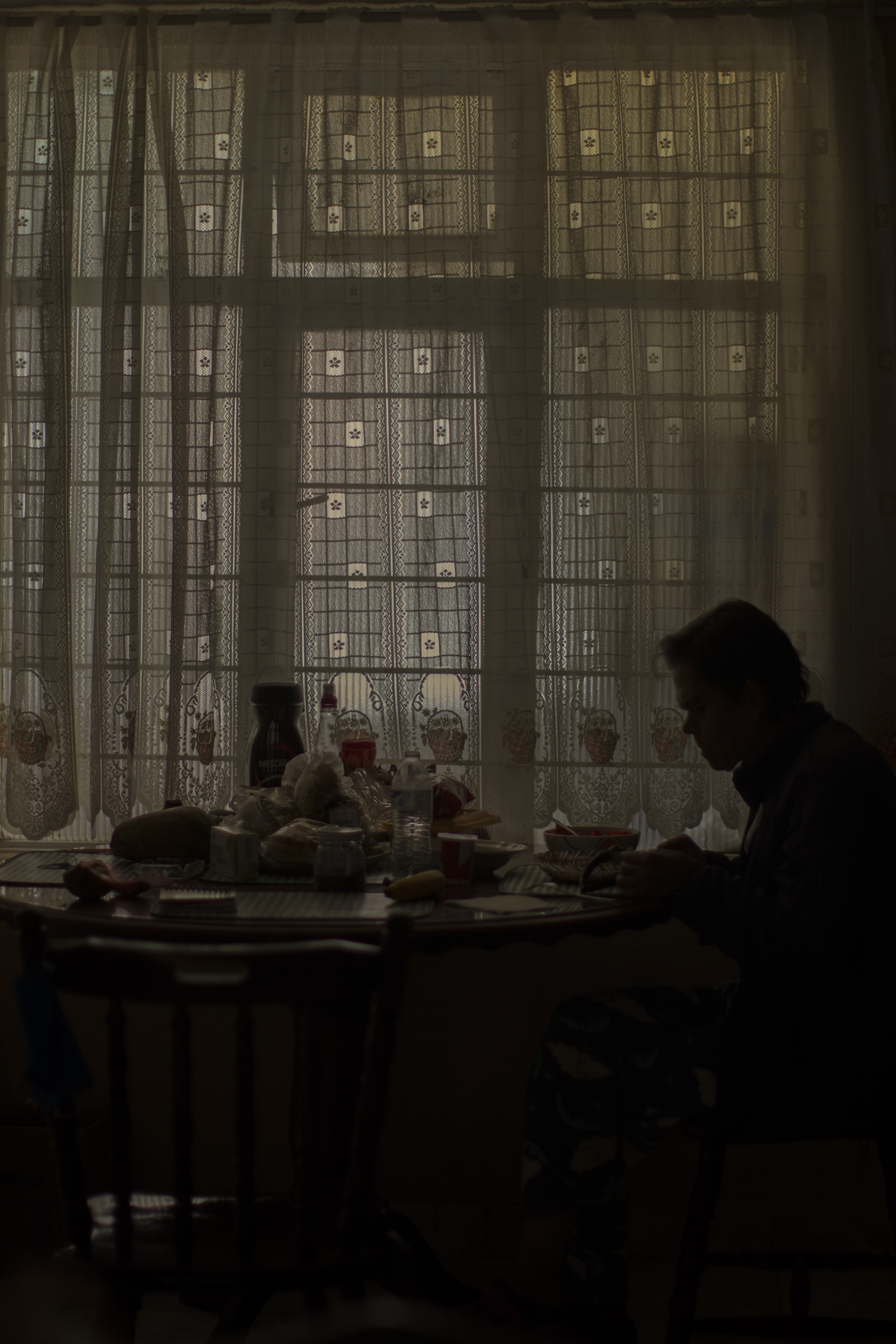 Her features are drawn, visibly suffering because, as the photographer states, ‘having schizophrenia is constant pain.’ This pain originates from her aunt’s medication and fears, which cause her to be isolated and make her anxious. Beyond the facial indications, however, it is not obvious that Auntie is affected by mental illness.