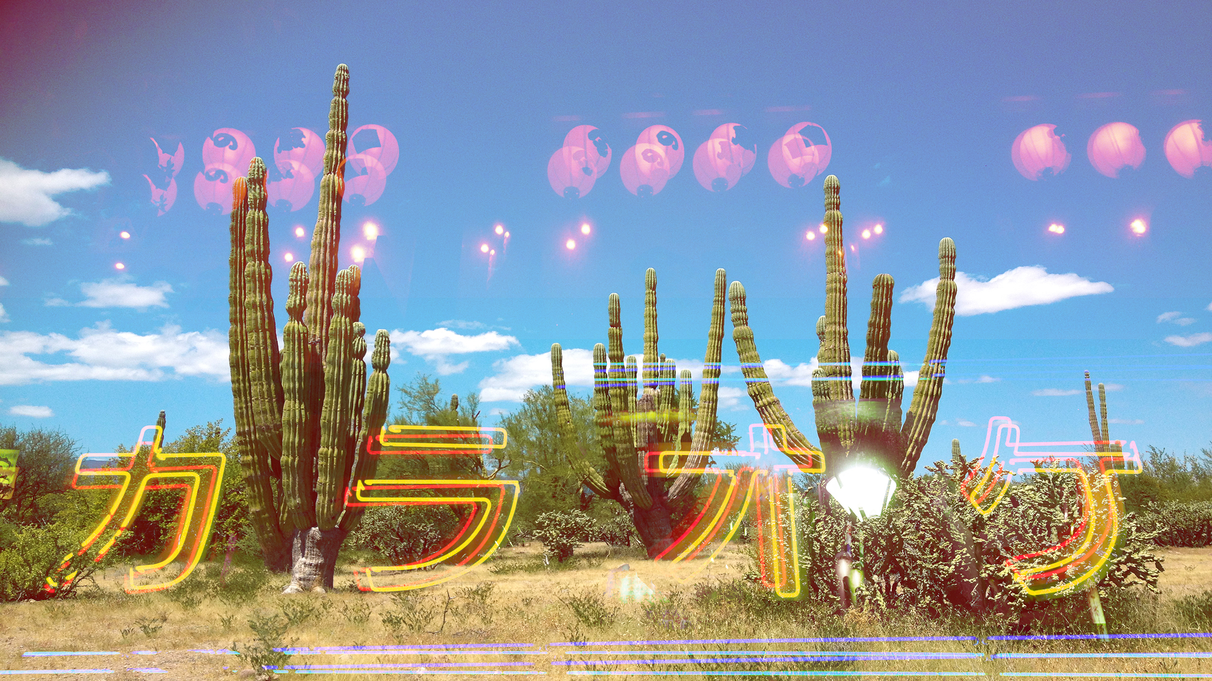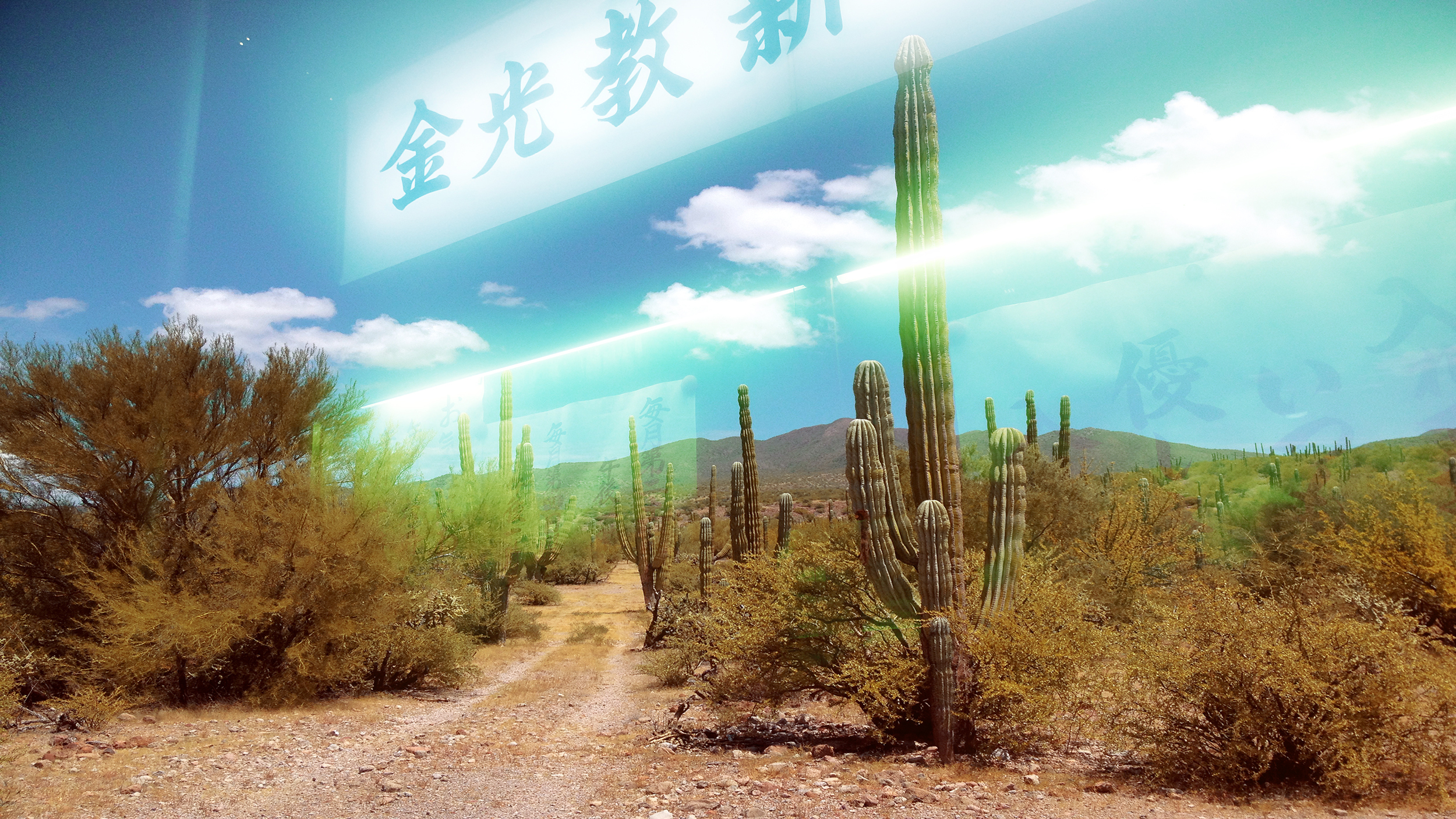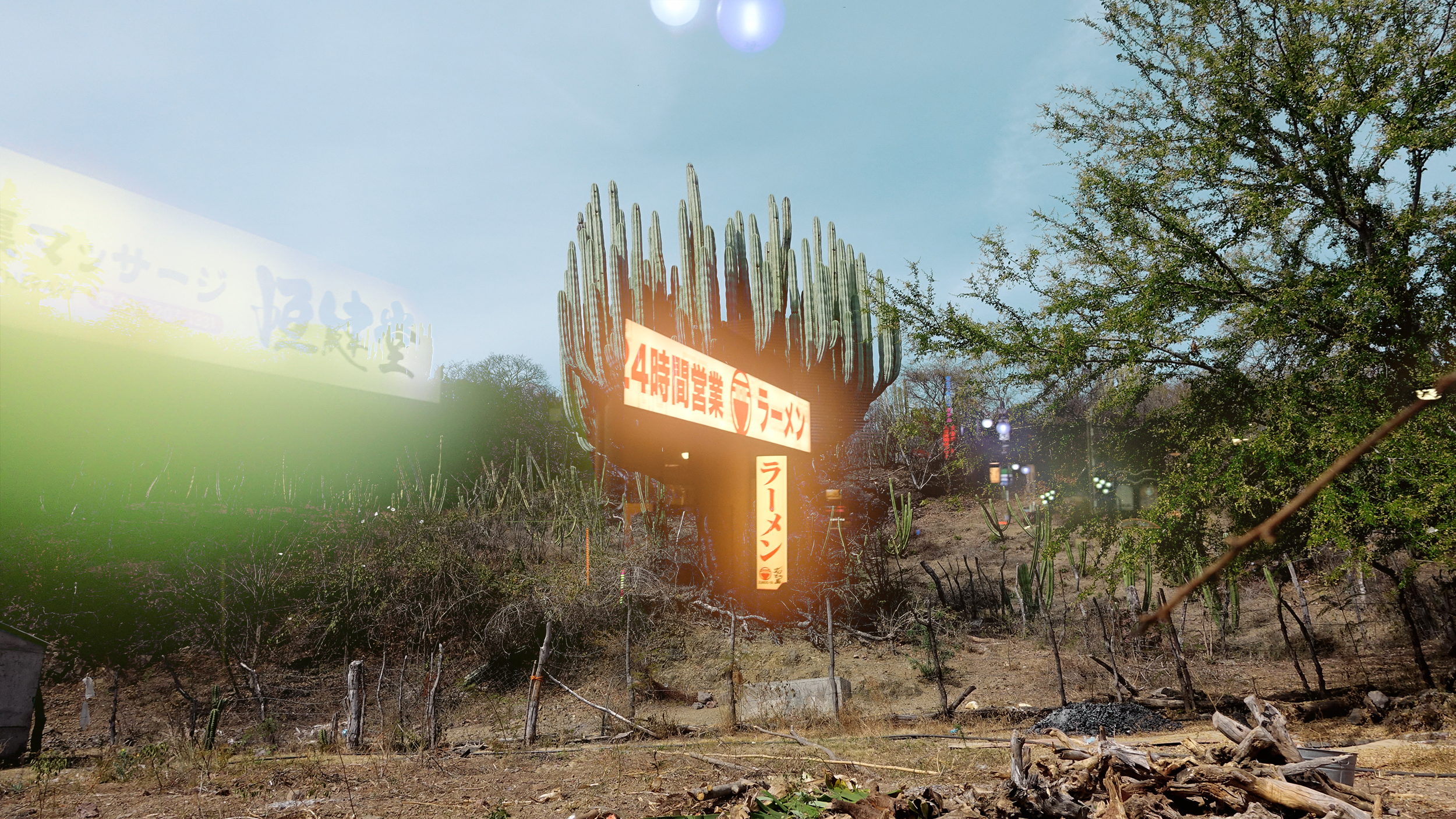 Aiming to illustrate the proximity the artist perceives to exist between the two countries and cultures, the series サ和ロ (saWAro) is composed of photographic montages that bring together shots of the two environments. Thus, the cacti in Baja California Sur merge into the neon lights captured in the Otakibashi Dori district of Tokyo, while those of Guadalupe Tulcingo stand alongside the illuminated panels of a sign found in Shinjuku district.