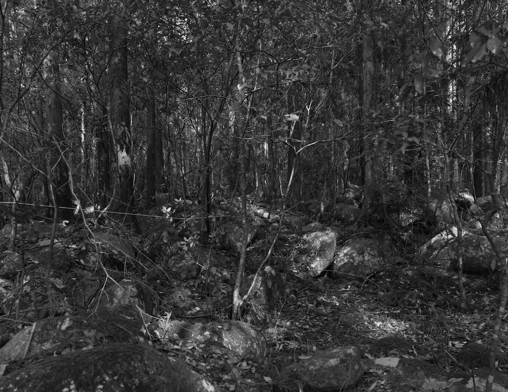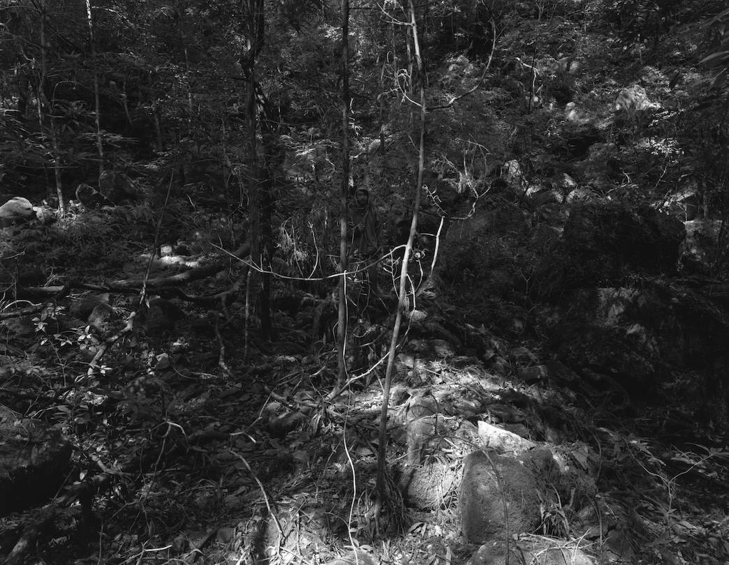 Shot in high contrast black and white, the photographer is barely visible in the photographs, blending into the dense vegetation that surrounds him—the cable release, however, is an immediate indicator of his presence. Known for his experimental technique, the photographer’s cable release becomes both a central concept and a compositional element in the artist’s endeavour to depict the spaces between man and nature.