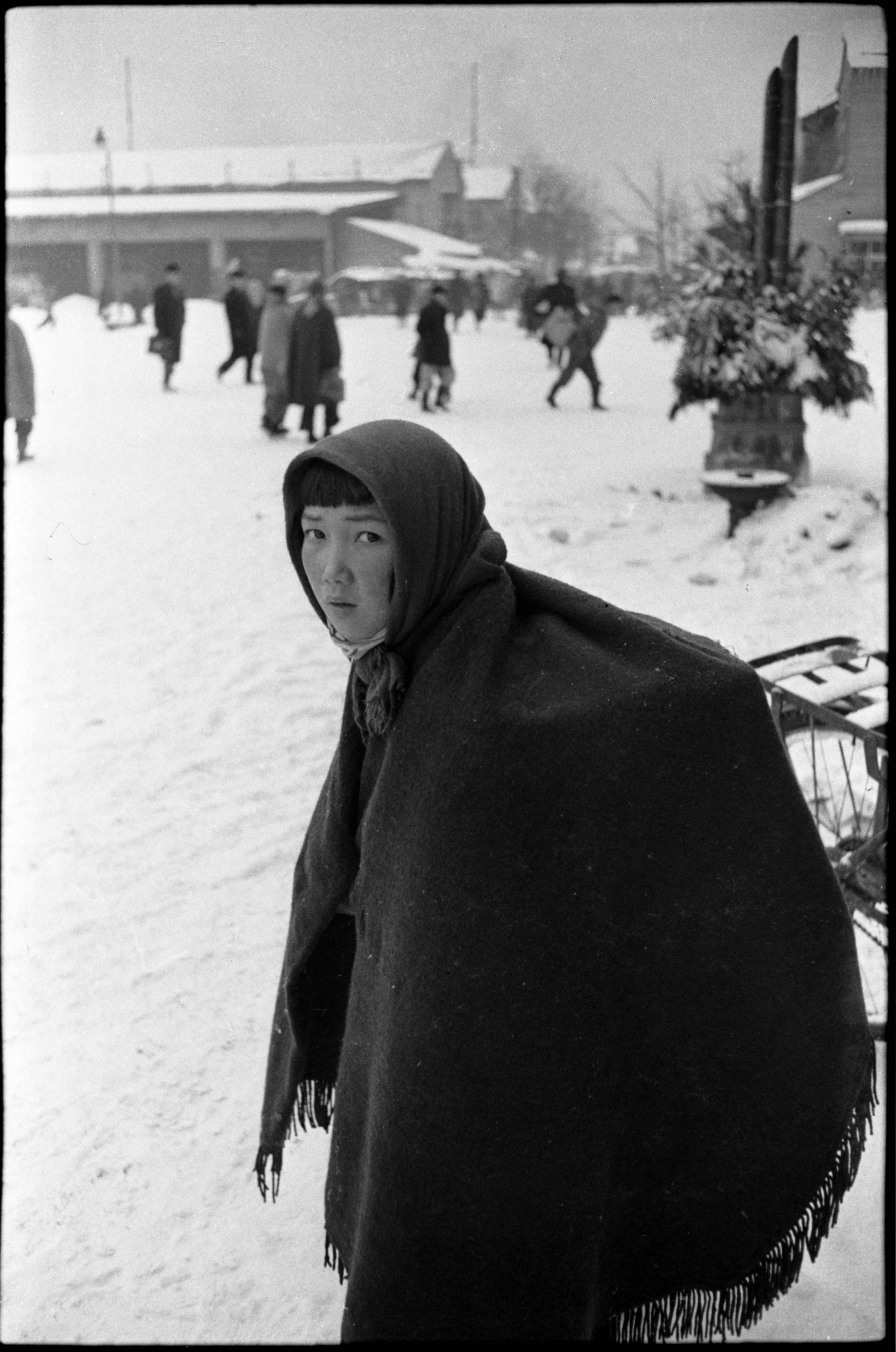 The black and white photographs taken by Shoichi Kudo (born in 1929) present a rural, impoverished Japan just beginning to recover after the war, in a region known for its harsh climate with long winters. They are snapshots of the photographer’s everyday environment. ‘Many of the pictures date from the early 1950s, and appear to be snapshots taken en route to work at To-o Nippo in Shinmachi from the house in Kitakanazawa where he lived before he was married, or from Okidate, where I grew up’, Kanako Kudo explains in the afterword to the book. ‘Prior to purchasing a car, it seems my father walked to work each day, with his camera. Other pictures may [have] come from vacations taken with photographer friends, or during breaks on news assignments, but we can only guess.’