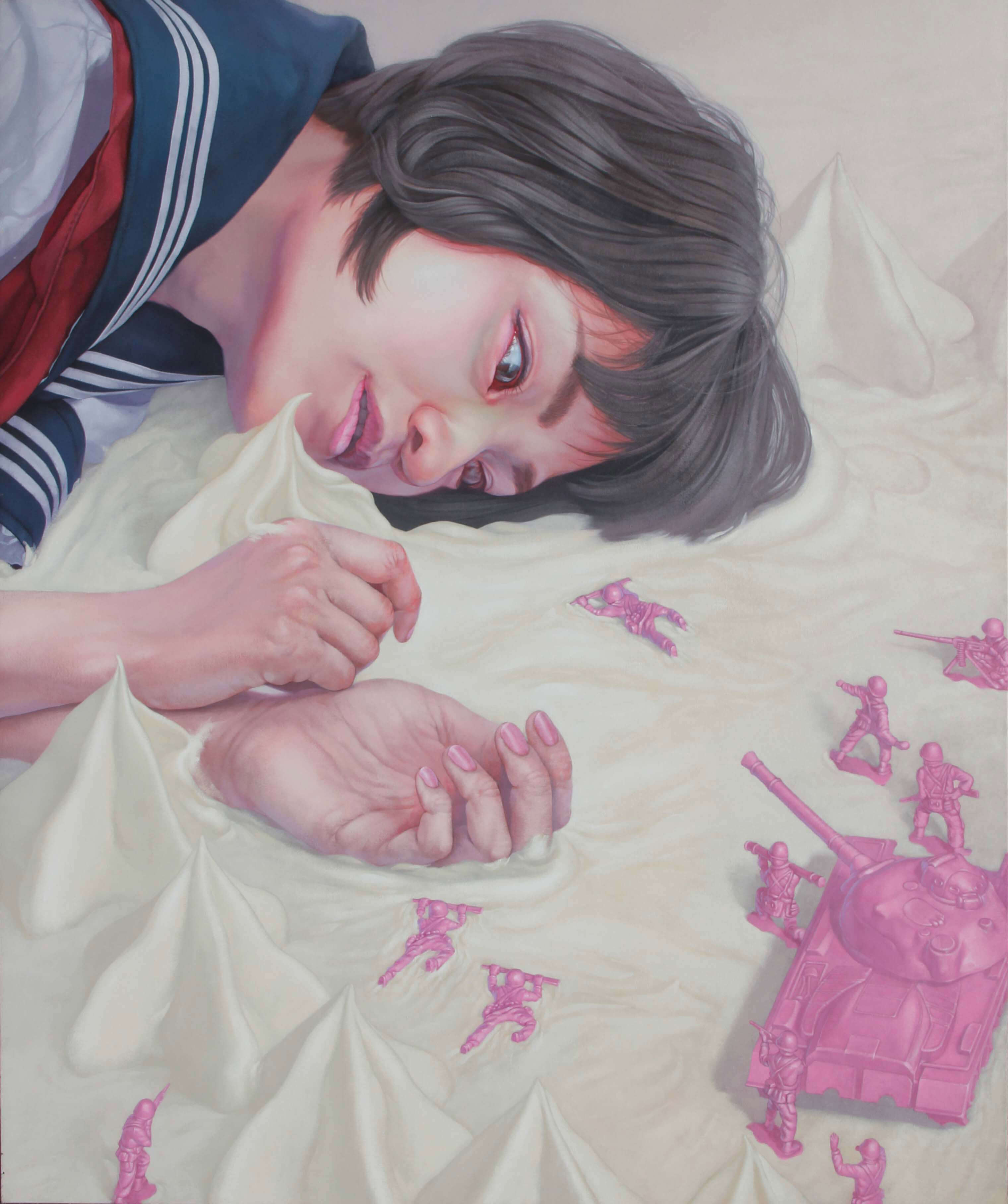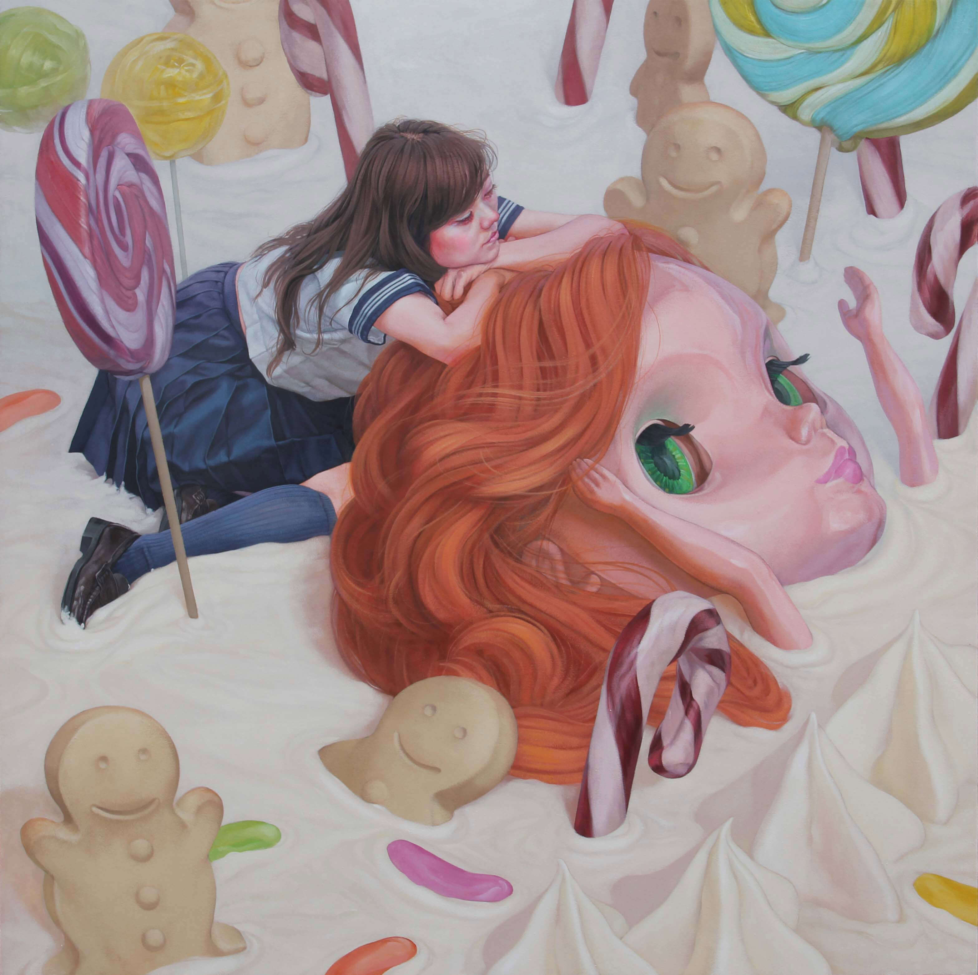 Kazuhiro Hori’s paintings depict young girls in colourful environments, packed with cuddly toys and sweets. These young schoolgirls are dressed in se-ra- fuku, the Japanese term for a sailor uniform that is worn by female secondary school and college students. There is no doubt as to the age of the individuals represented. They are young, and are going through a period that combines the joys of childhood and the discovery of one’s body and relationship to others. ‘While expressing purity and youth and [cheerfulness, sexuality] is evoked’, the artist explains in an interview with the New York Optimist.