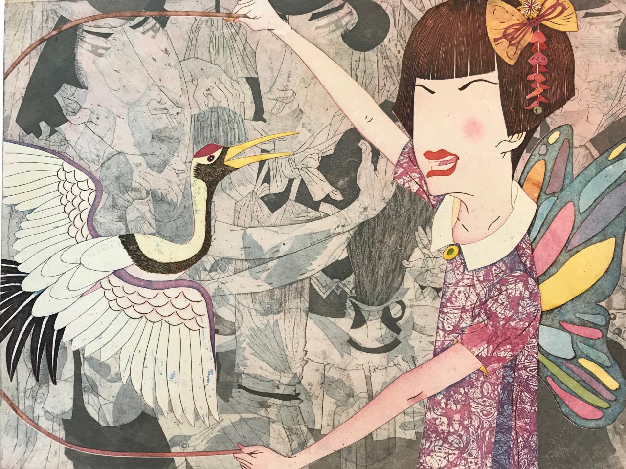 Satire, humour, or any kind of emotion are nowhere to be found in the eyes of the characters presented in Yuji Hiratsuka’s engravings. This is for the simple reason that their eyes are not depicted. Nevertheless, the way in which the artist plays with cultural references, colours, and staging invites the public to detect a message there. As Yuji Hiratsuka explains to Pen, ‘by leaving less facial features (no eyes), the viewer can extend their imagination… I like ambiguity.’