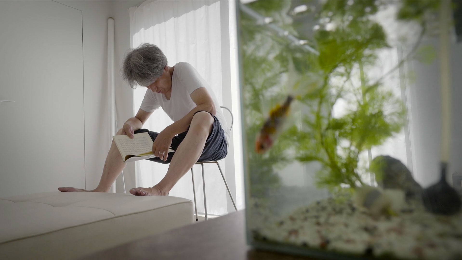 Then, his silhouette appears at last: after plugging in his hi-fi, he sits in a chair in the middle of this room that the viewer imagines is entirely dedicated to music, takes a sip of a drink and looks straight at the camera. With slightly dishevelled grey-white hair and wearing a white T-shirt and shorts with narrow stripes, this is Moriyama-San.