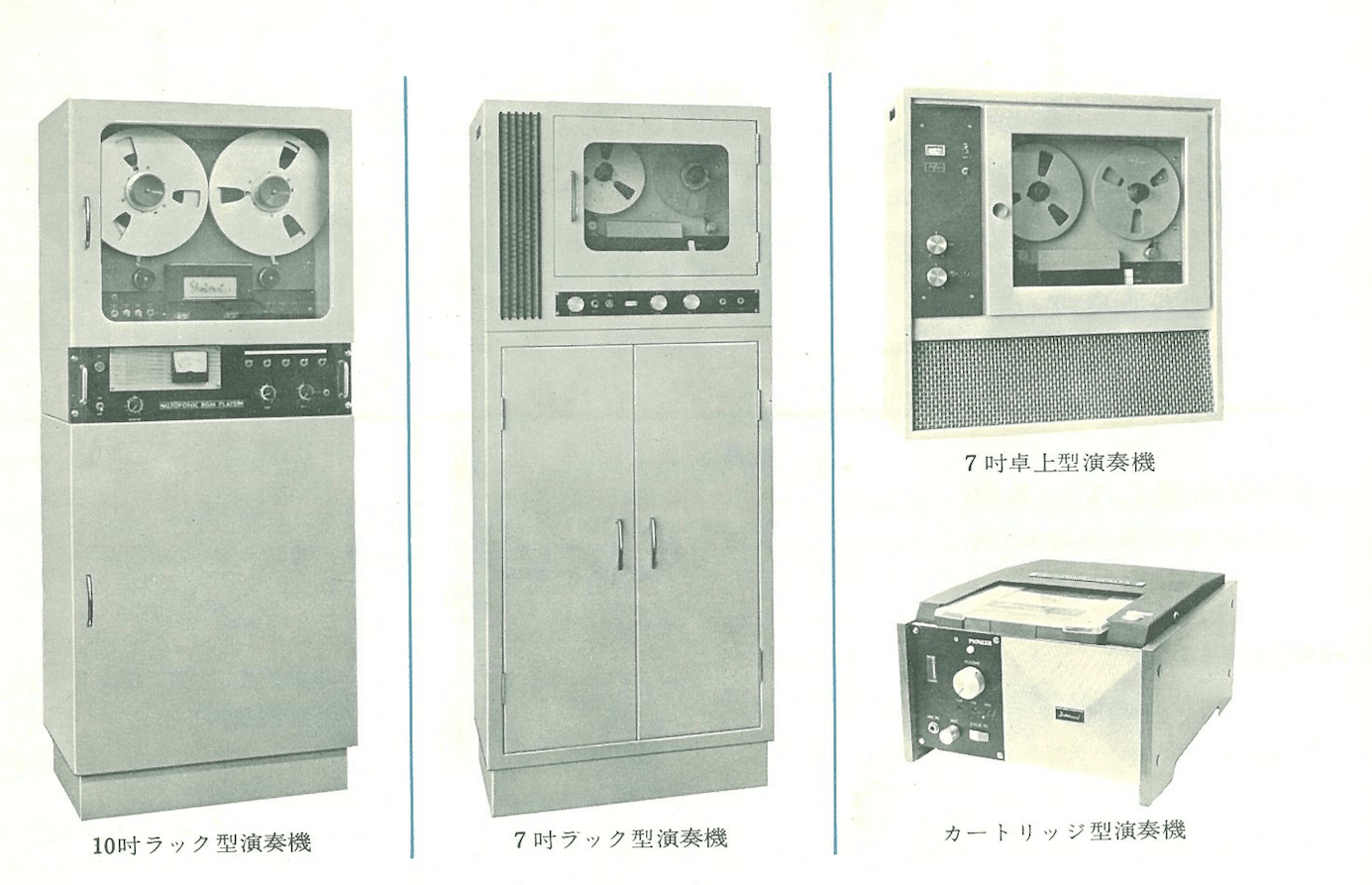 Original ‘BGM players’, beginning as large machines for open reel tapes in the 1950s, then developing into lighter cartridge players by the 1980s. Courtesy of Toyo Media Links.
