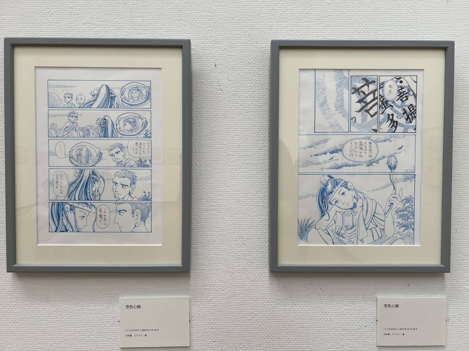 Published twelve years after her previous long-form work, Sora-iro Shingyō (The Heart Sutra in Sky Blue, untranslated) uniquely blends the Heart Sutra with the reality of the COVID-19 pandemic, connecting a timeless universe with the everyday. The exhibition presents the cover illustration, selected original pages, and a handwritten manuscript, serving as a blueprint for the story.