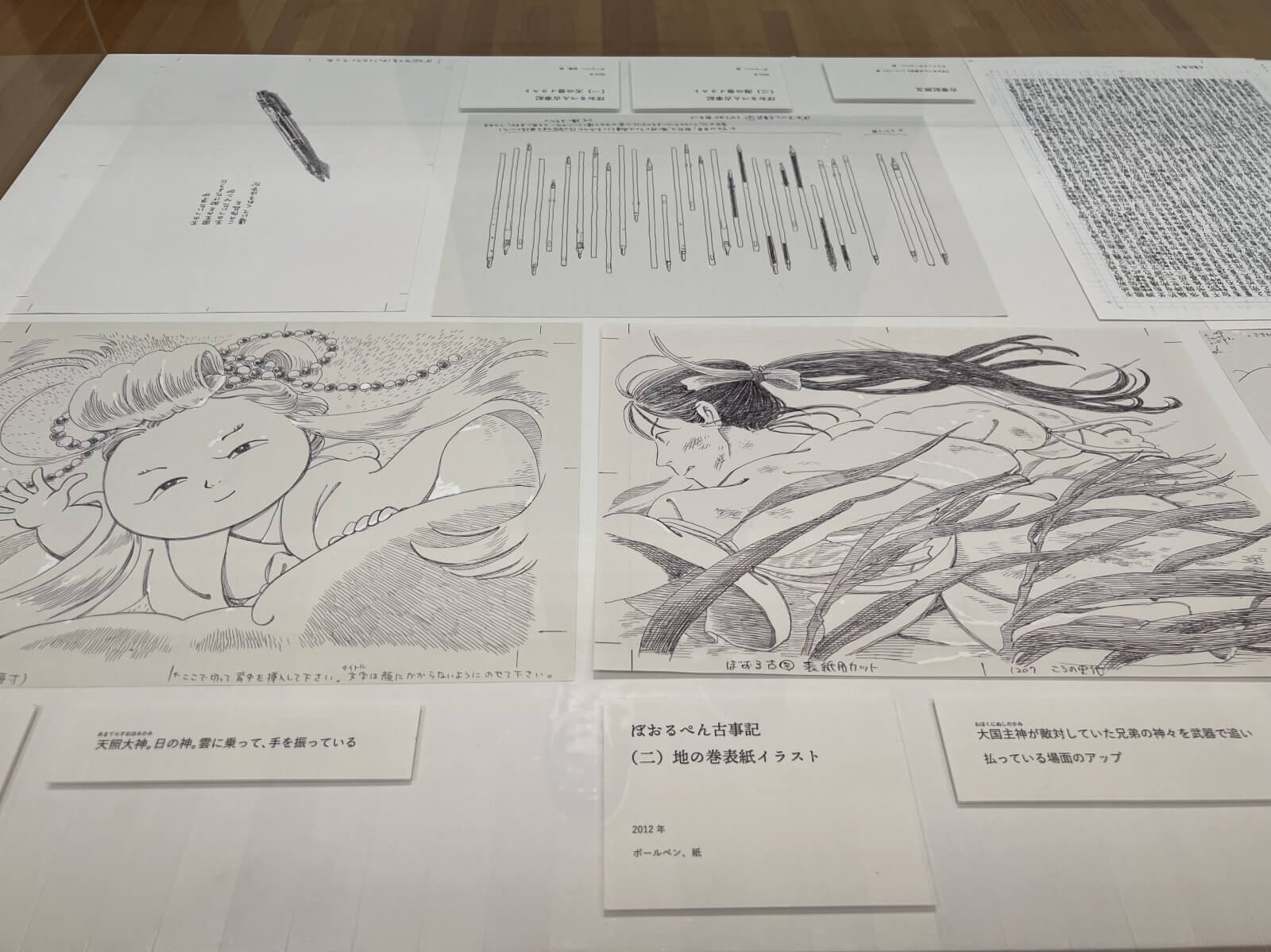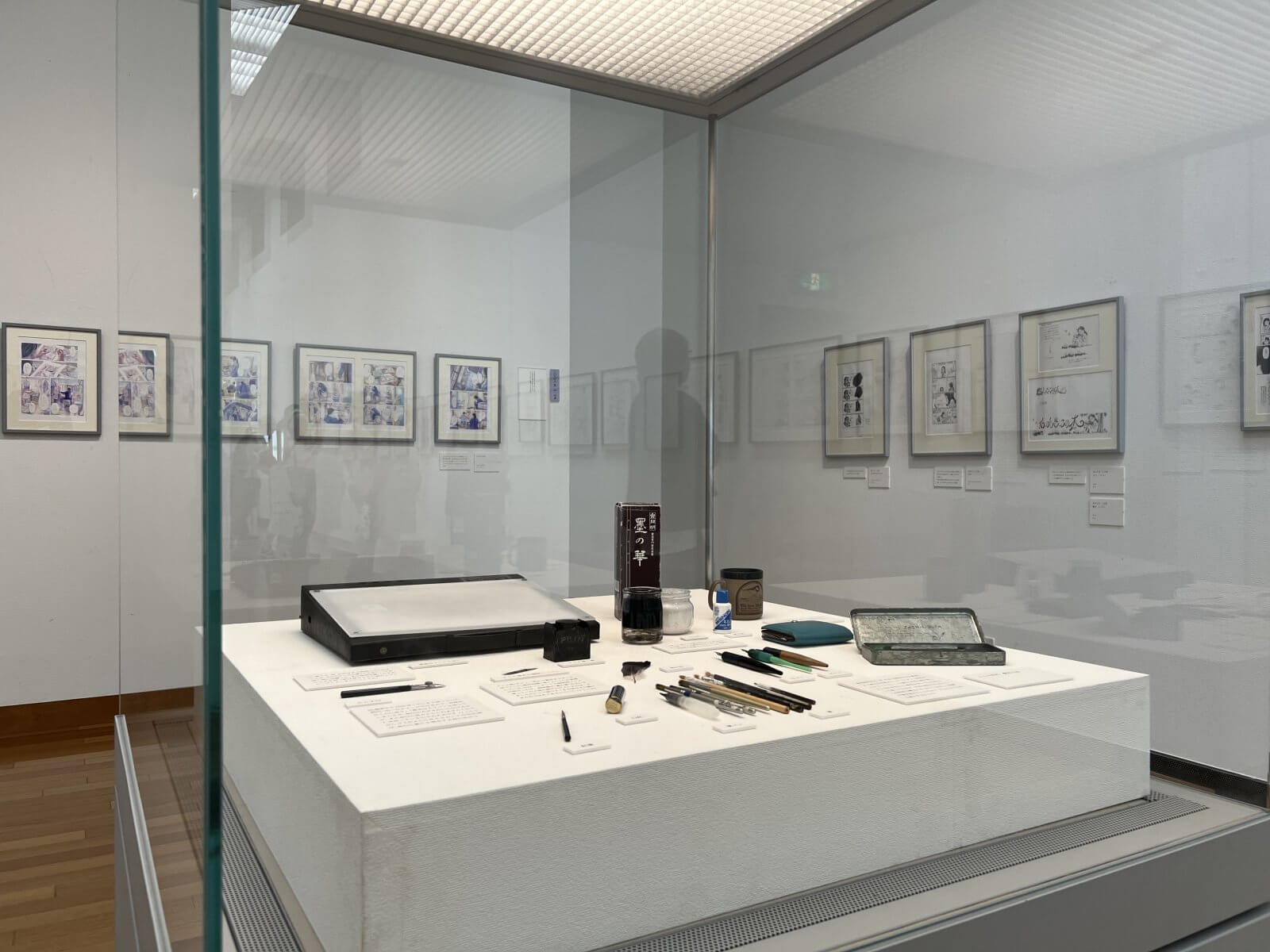 From the exhibition ‘Fumiyo Kōno: 30 Years as a Mangaka’. In the foreground: Fumiyo Kōno’s favorite tools, including brushes, dip pens, and ink bottles.