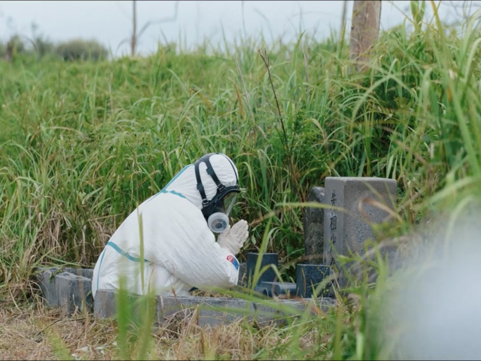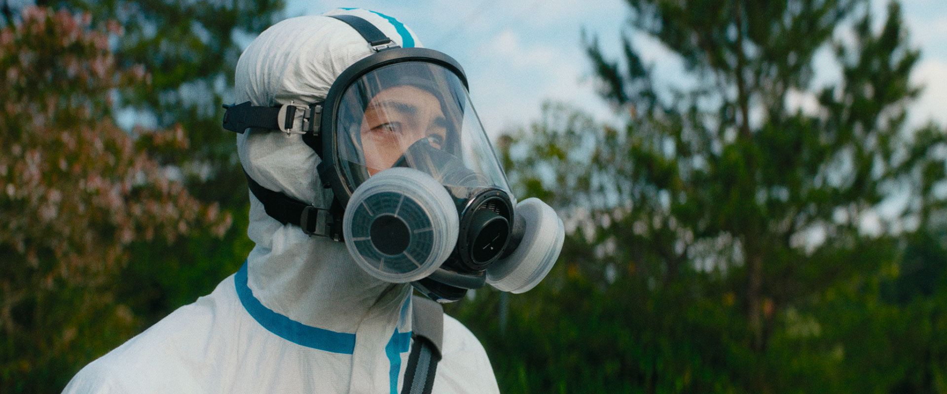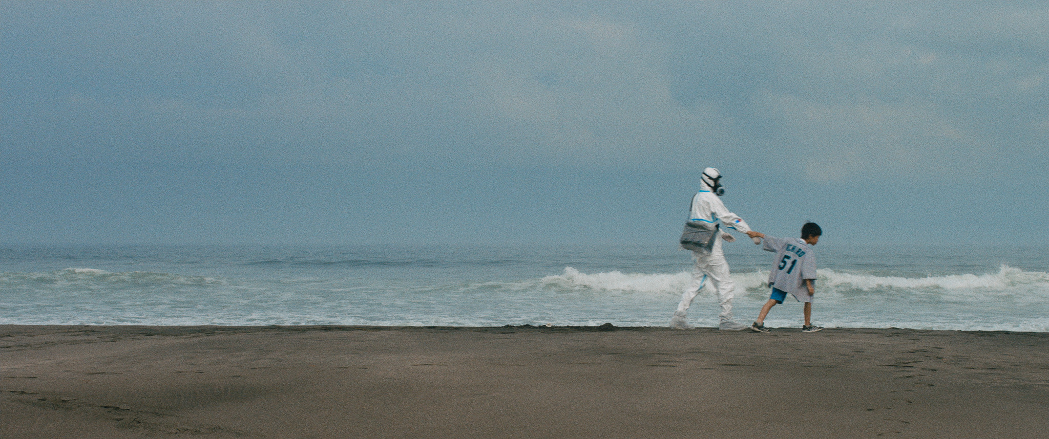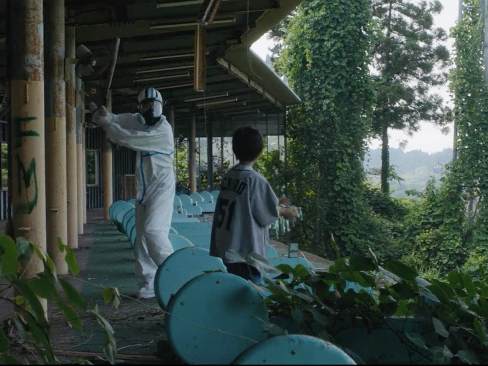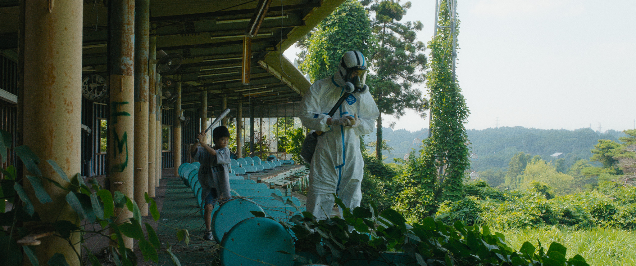 The fortysomething, who lives in a displacement camp where prefabricated huts are spread over hundreds of metres, regularly goes to the no-go zone. He does so as a ‘collector’, to help his neighbours find objects they had to leave behind, but above all to persistently search for the baseball belonging to his eight-year-old son. The latter appears at his side, but is strangely wearing a t-shirt while Murai is decked out in a full-body protective suit, wearing a gas mask and relying on the acoustic signals emitted by his Geiger counter.
