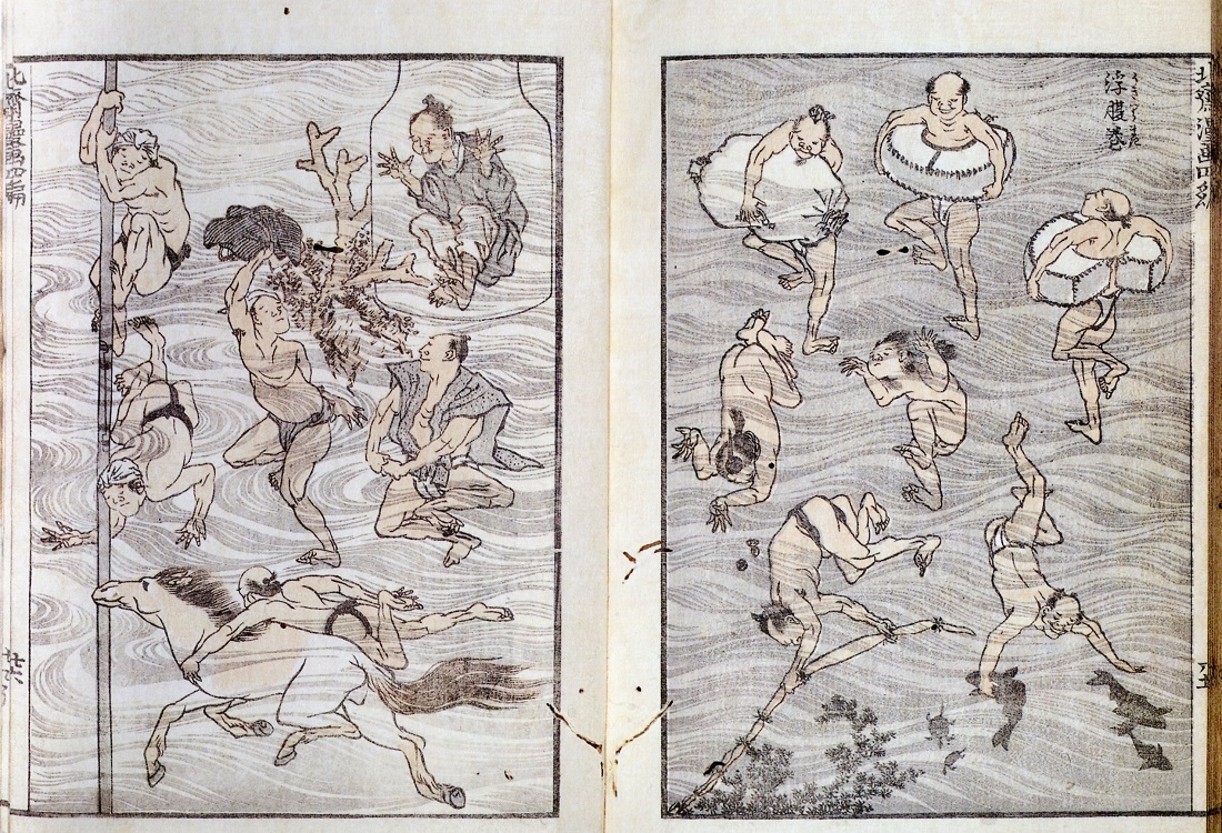 Thousands of images depict flora and fauna, infrastructure, the supernatural and spirits, martial arts techniques, and scenes from everyday life; some art historians consider that the prolific nature of Hokusai’s production is thanks to the help of students. It is also within these manga, in volume one specifically, that Hokusai details his own personal theory of art, illustrated by 300 spontaneous drawings. Other theories suggest that the works were in part intended to be used as painting manuals, with the drawings becoming popular as models for reproduction.