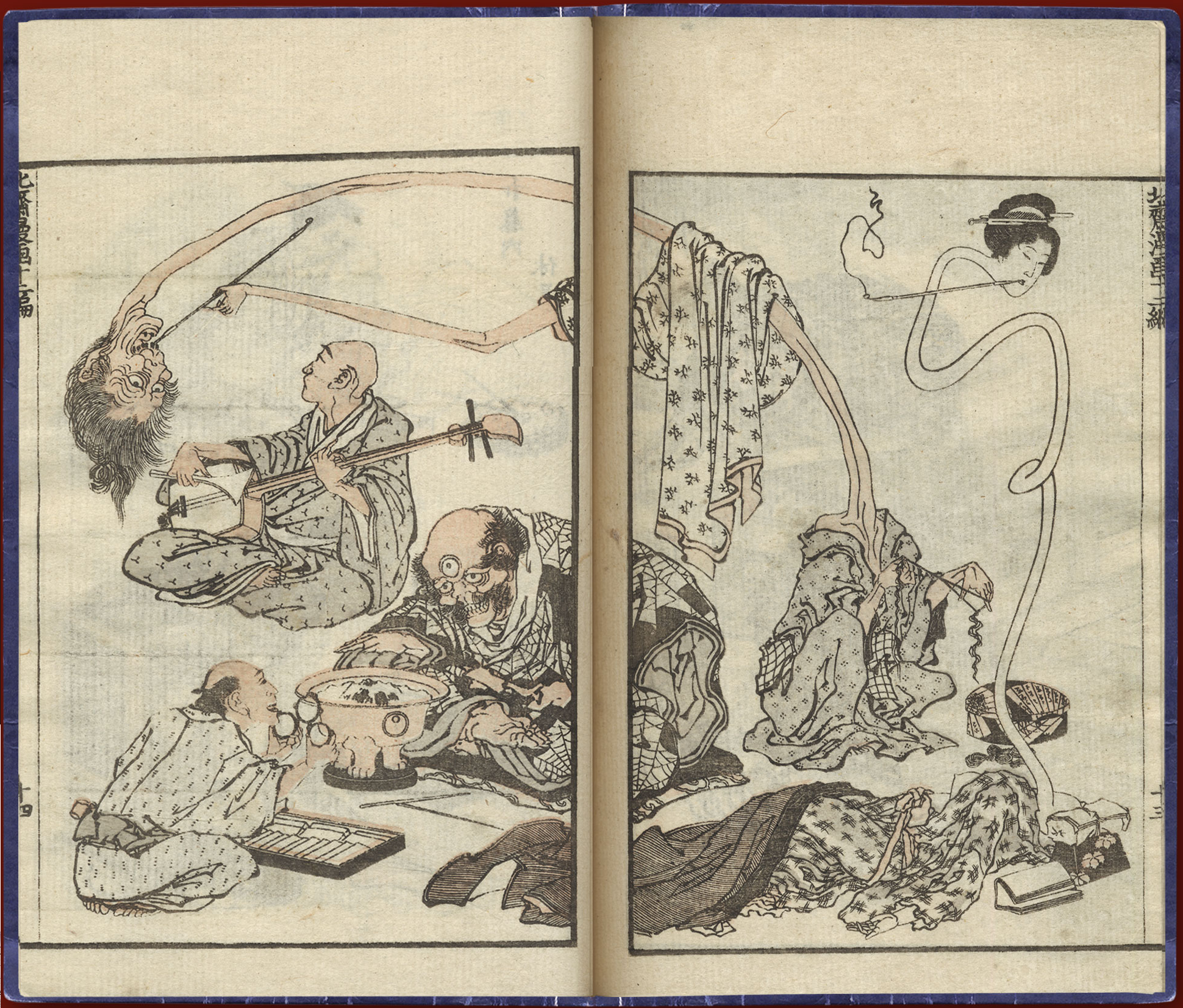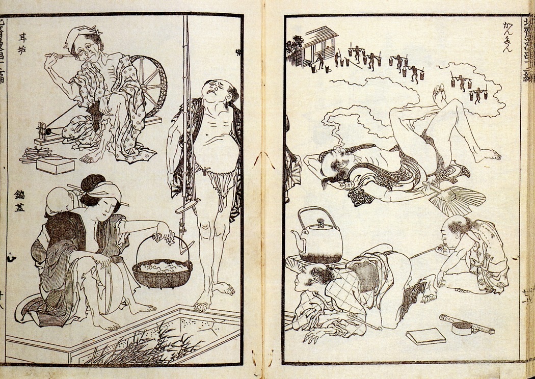 At the age of 55, in 1814, he began another artistic activity that would provide both financial stability for the artist as well as widespread success among the public. For over 60 years, he published sprawling manga across 15 volumes, each of which contained 60 small leaflets.