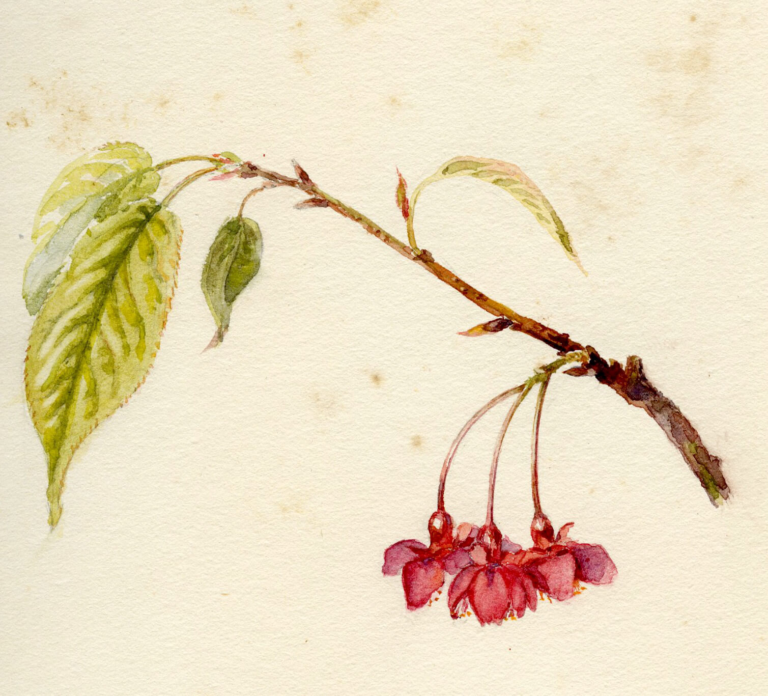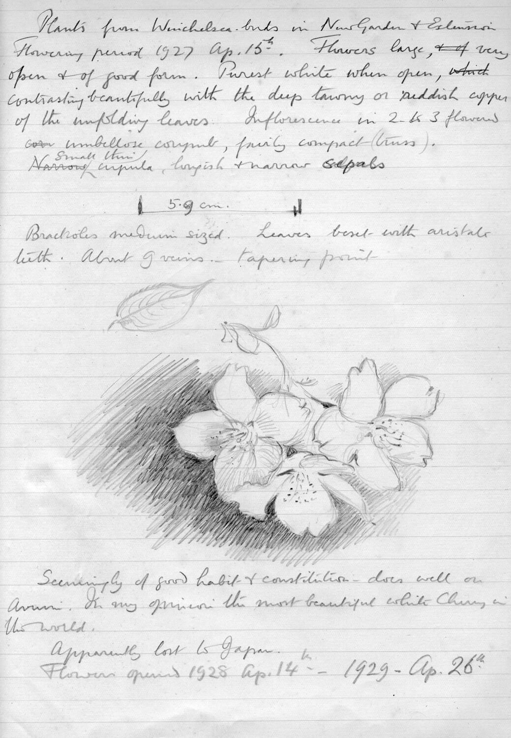 Kanhi-zakura, described as Prunus campanulata, 1941, and a Sargent cherry leaf, 1939, from Ingram's notebooks