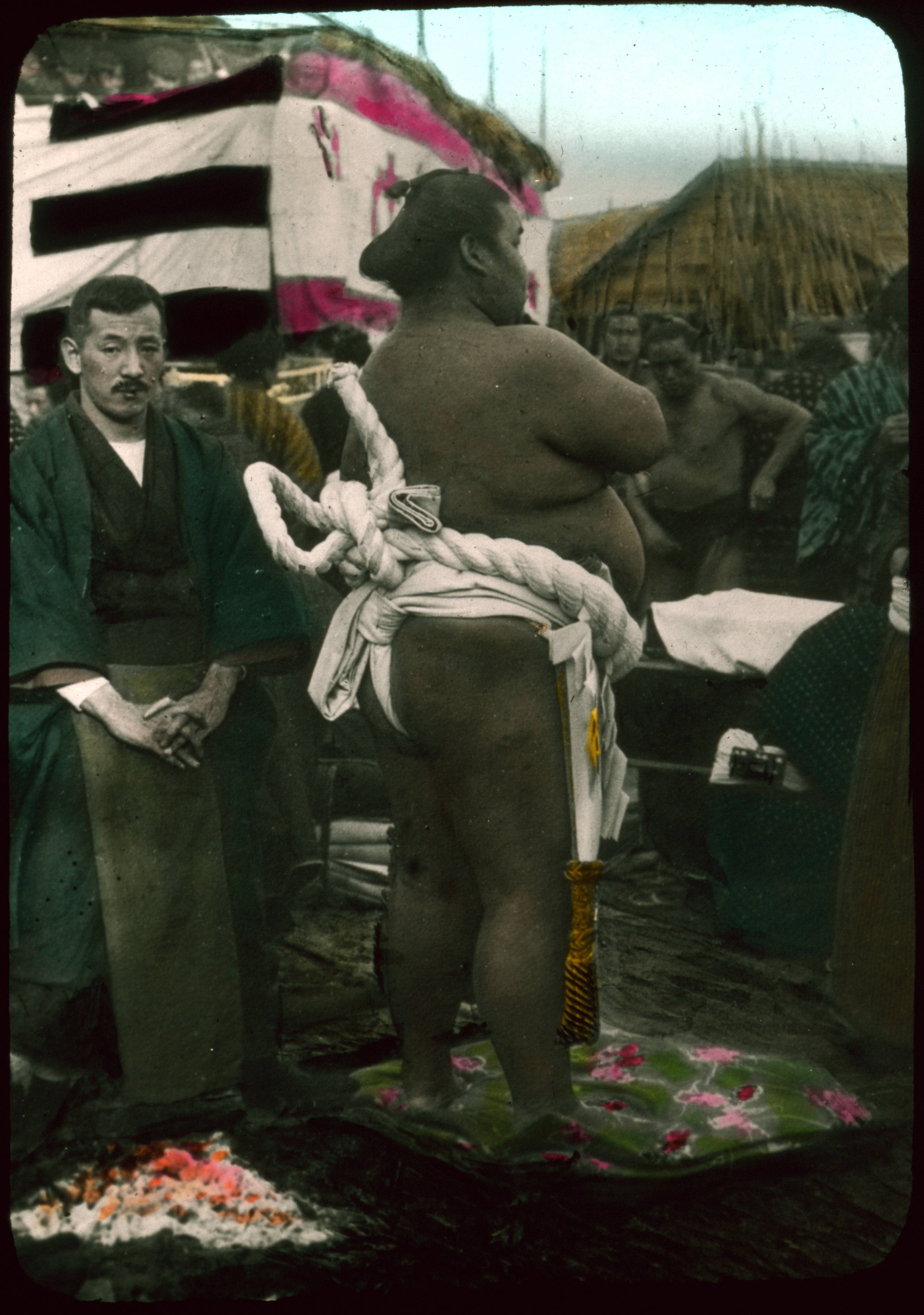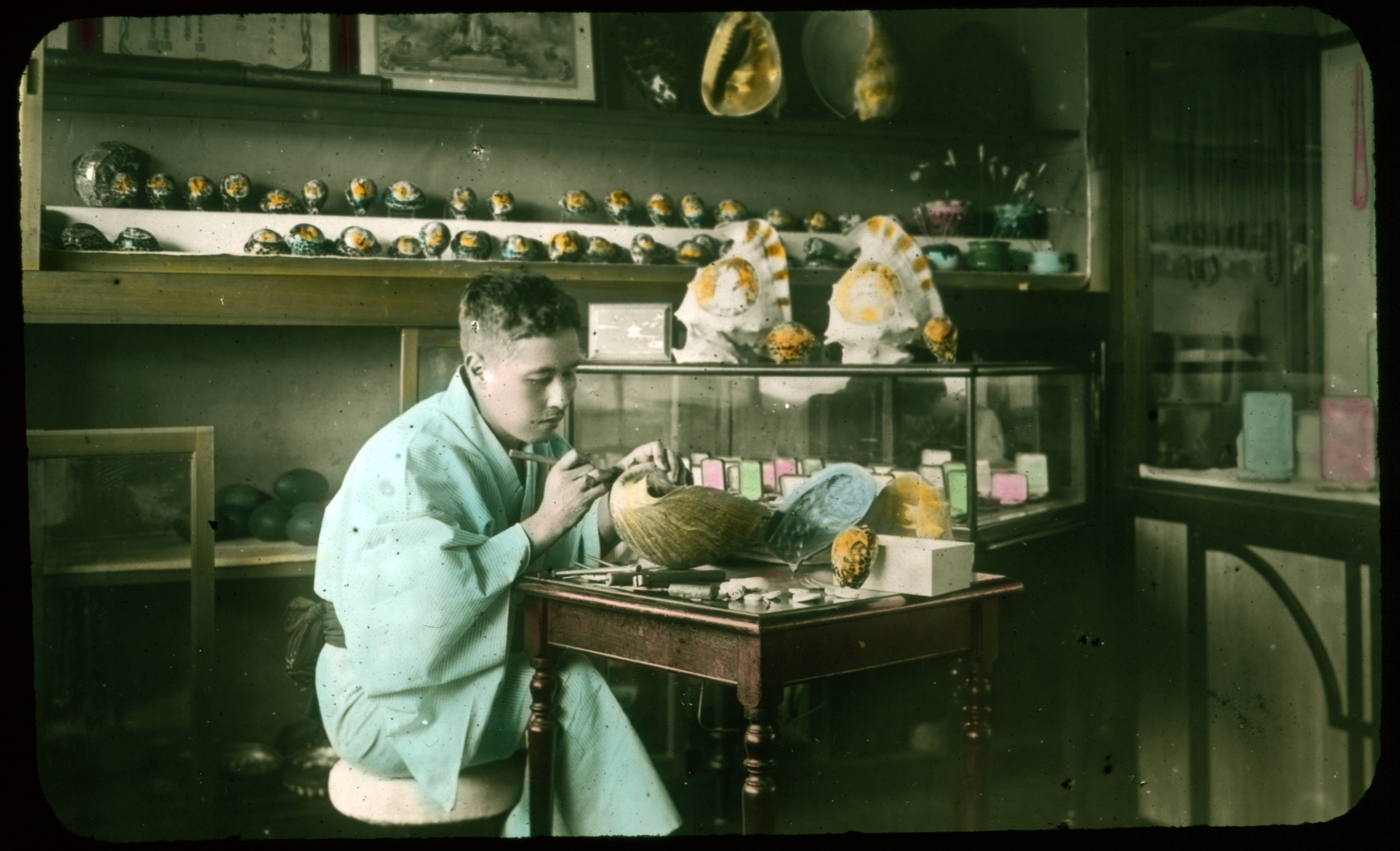 These objects were sold to overseas visitors during the Meiji era (between 1869 and 1912 approximately), before the emergence of cameras and postcards. These glass plates, like the photographic prints by photographers such as Kusakabe Kimbei and Felice Beato, were coloured by hand after being taken. This was a very popular practice, which, in the specific case of glass-plate photographs, made it possible to add density and variable contours to the subject through the use of transparency and variations in brightness.