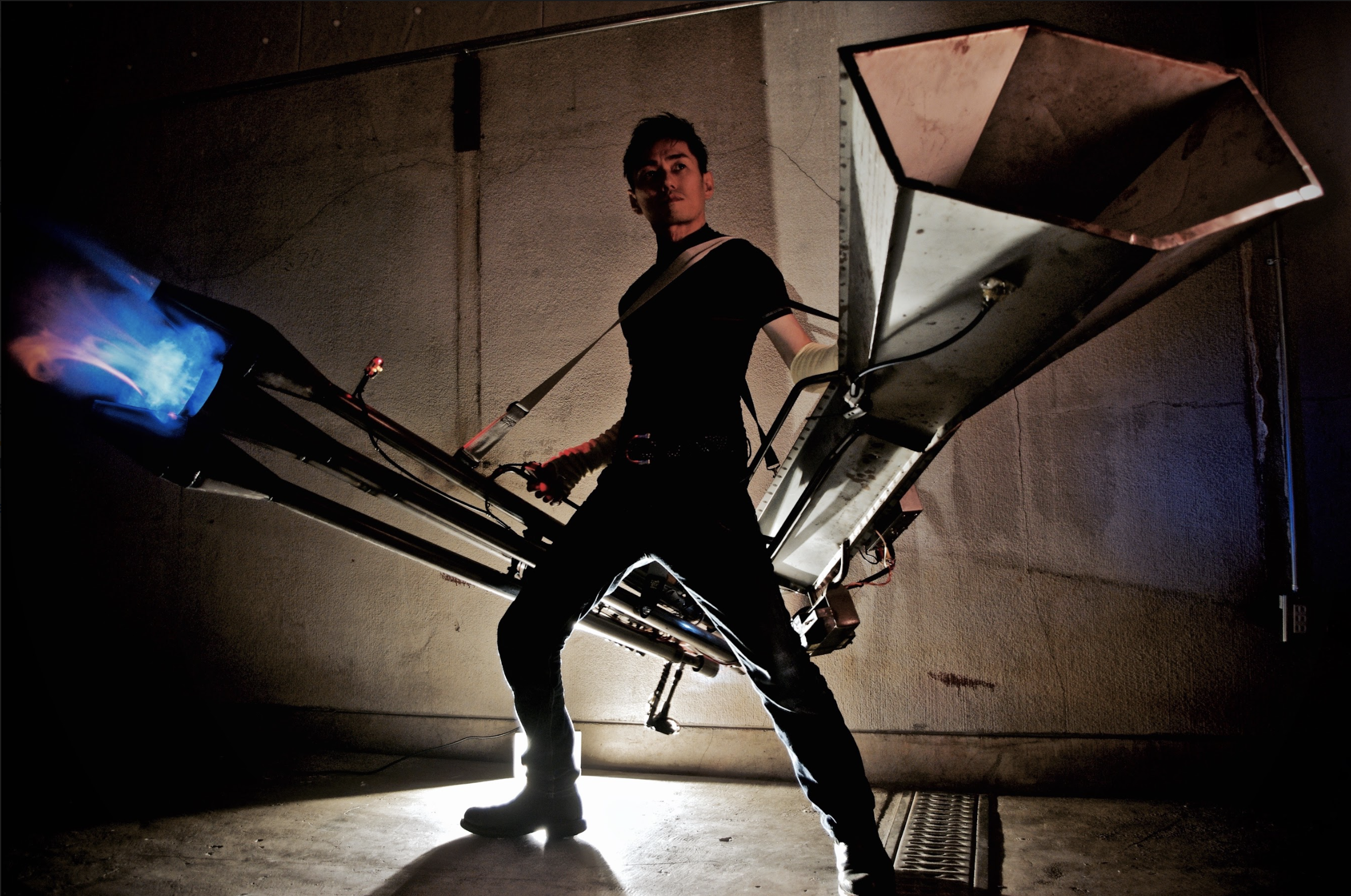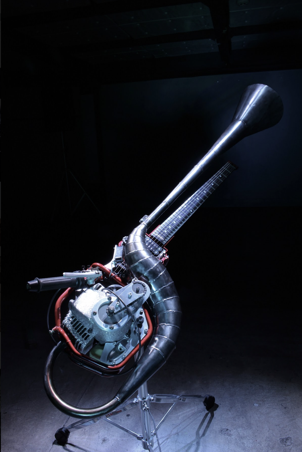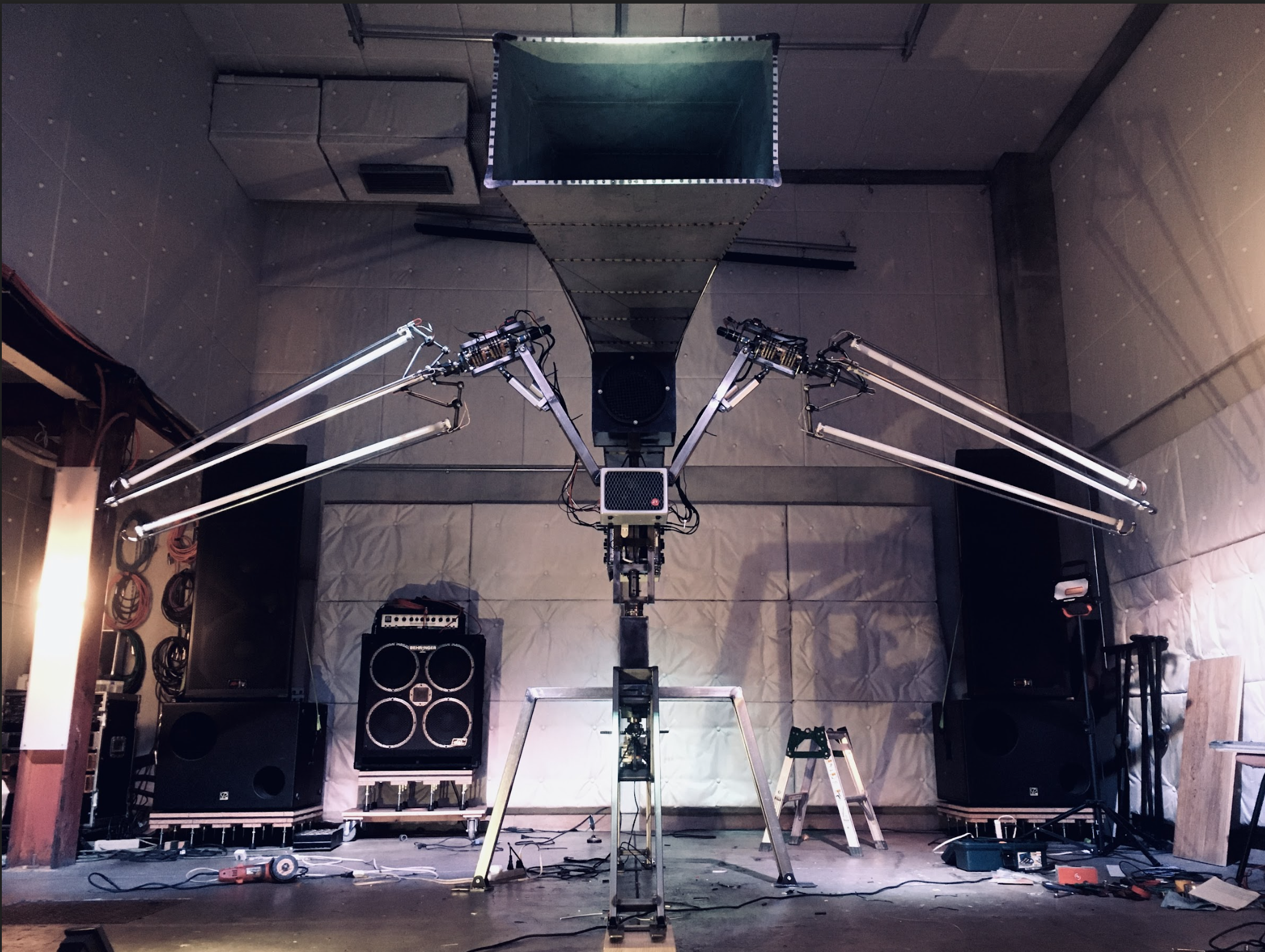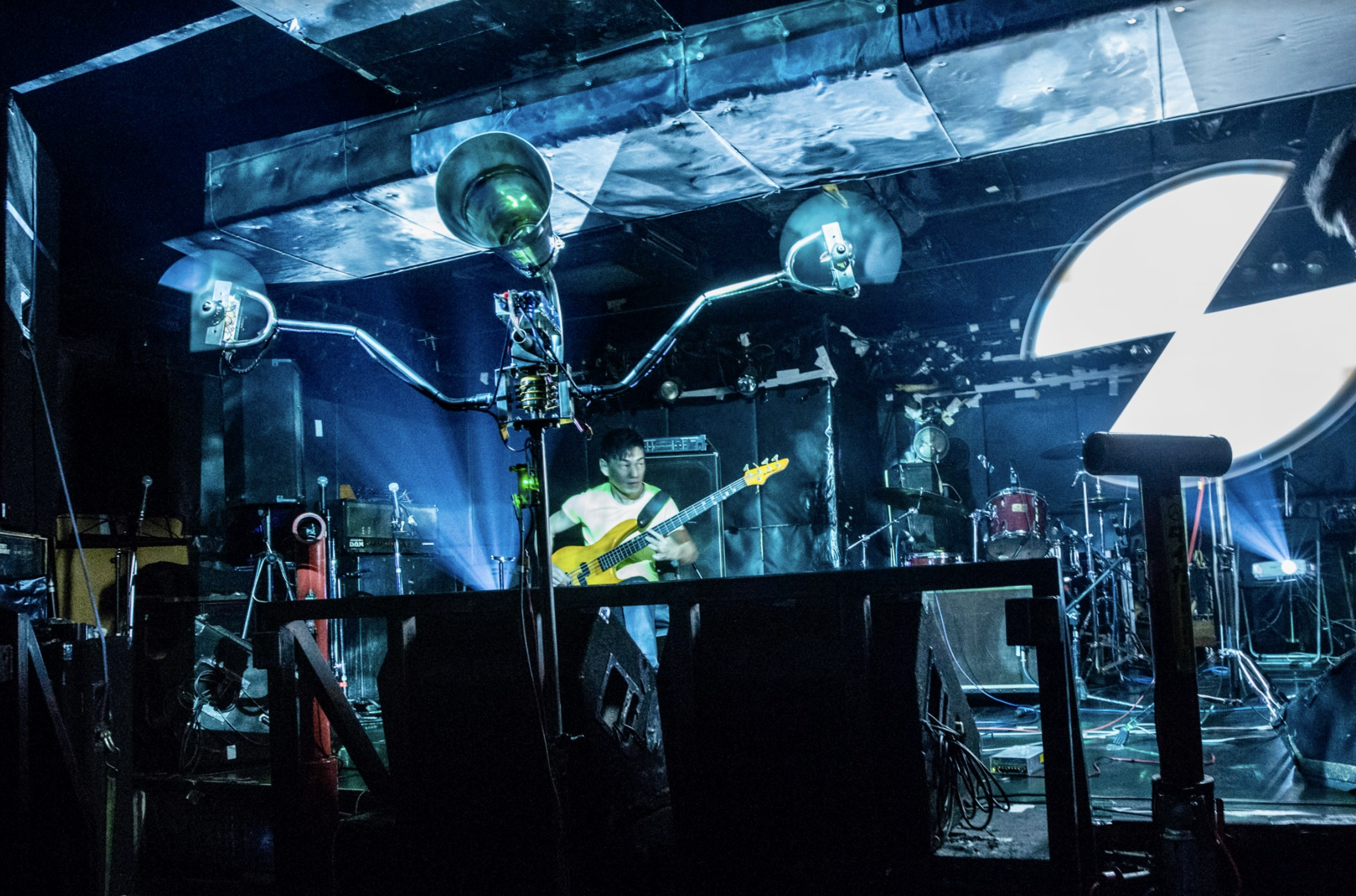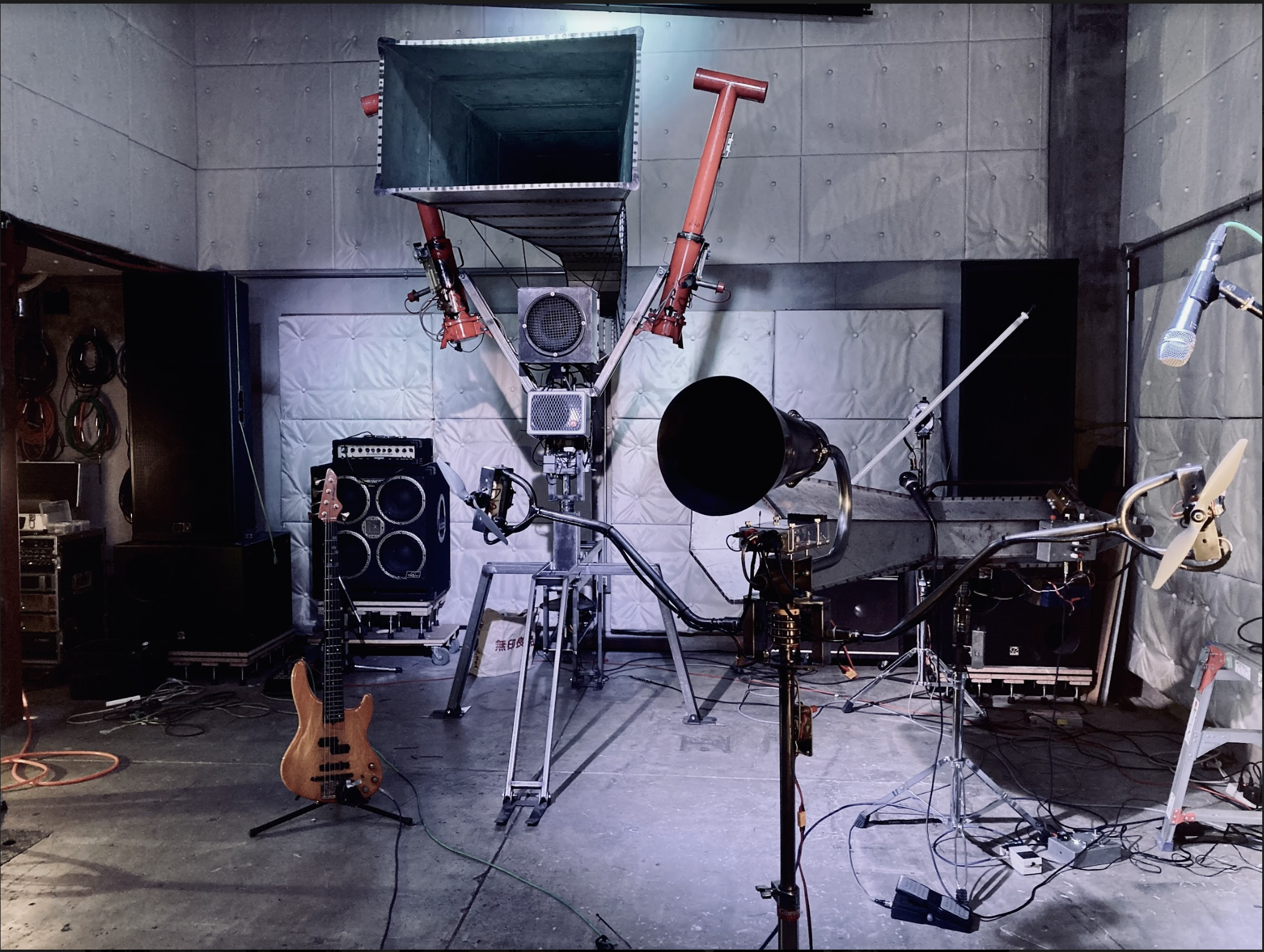 Led by Ikuo Shimizu, KAIRAI-BUNCH thematises the threat of mechanisation as inspired by battle robots and other Japanese science-fictional motifs. With Ikuo Shimizu at its core, it was founded by the former members of noise-rock band Space Streakings, a band which were known for their extensive experiment with industrial objects as incorporated into live music—embedding engines into guitars, or wearing gas cylinders on their backs fitted with truck horns. The performative large-scale installations of KAIRAI-BUNCH came about by engineering and embedding MIDI controls into some sculptures that they initially made out of scraps, allowing an entire live music performance to be controlled from its components.