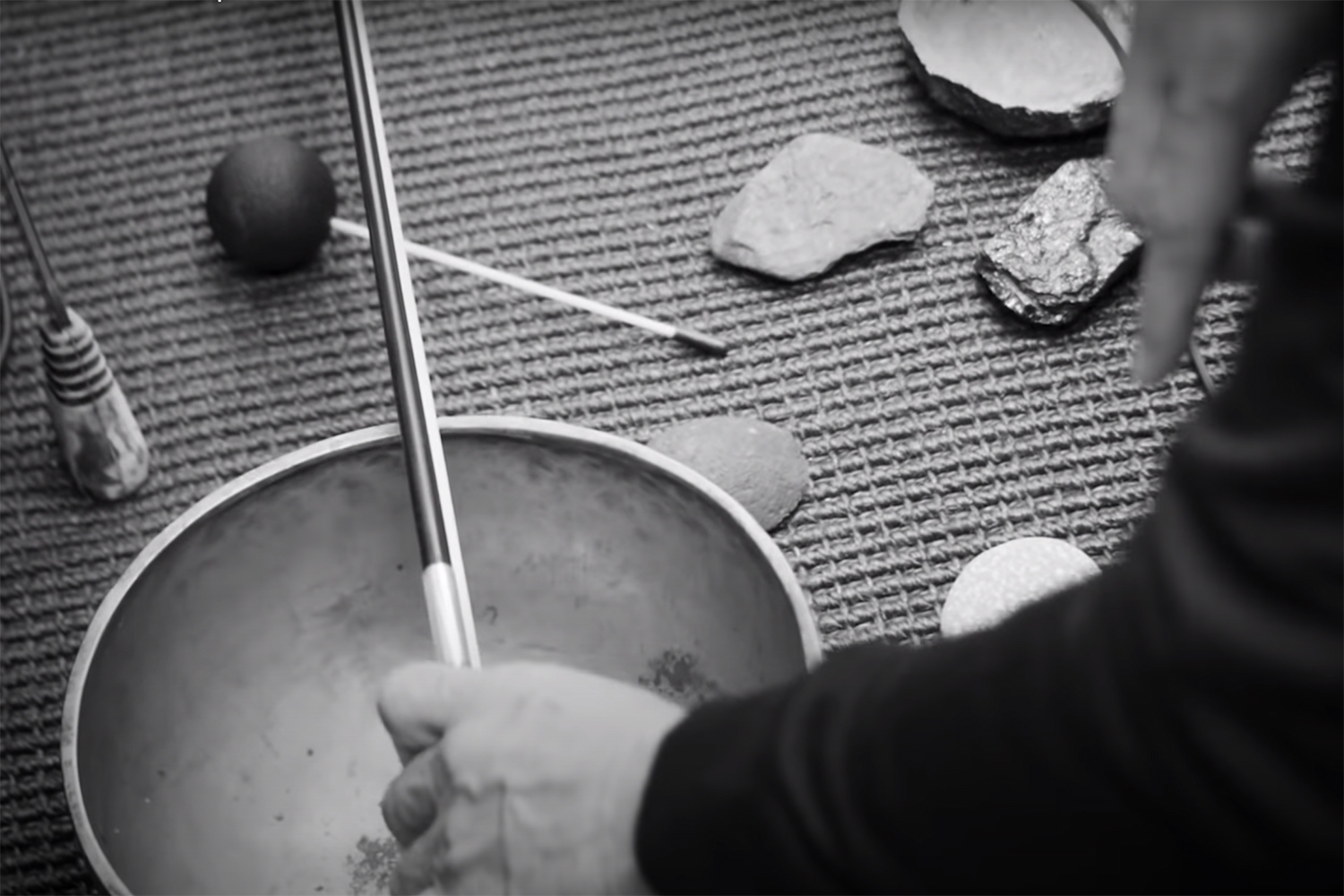 In this eclectic, almost meditative performance, the musician improvises sounds by hitting stones together gently, before sliding them across a cymbal or dropping them into an earthenware container. Ryuichi Sakamoto then picks up a crystal bowl and a Tibetan bowl, which he makes vibrate using a bow, before sitting down at the piano and then playing the electric guitar.
