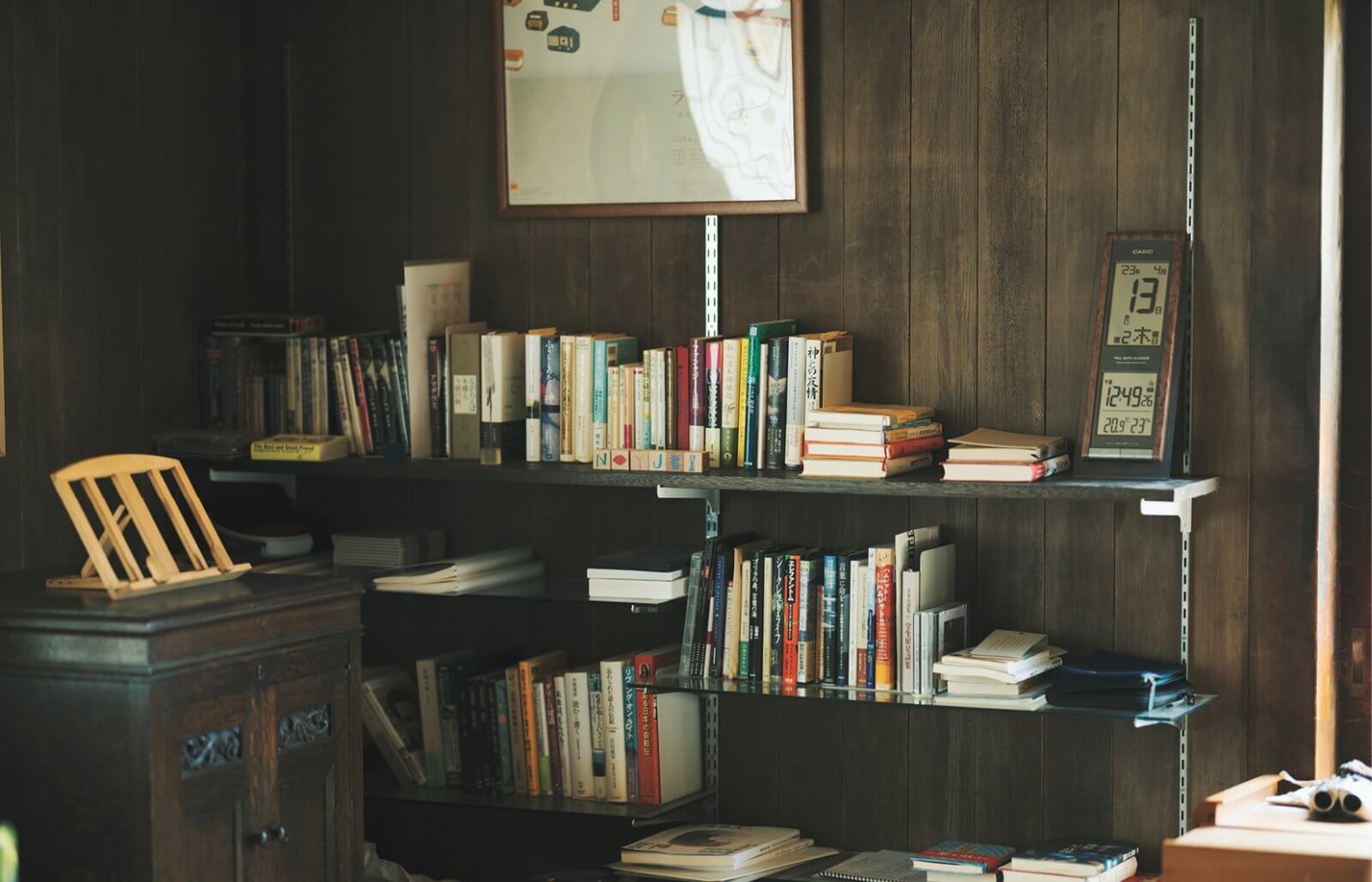 The house features a library, but bookshelves have expanded into the bedroom and hallways. Scattered around the living room are mostly recent books.