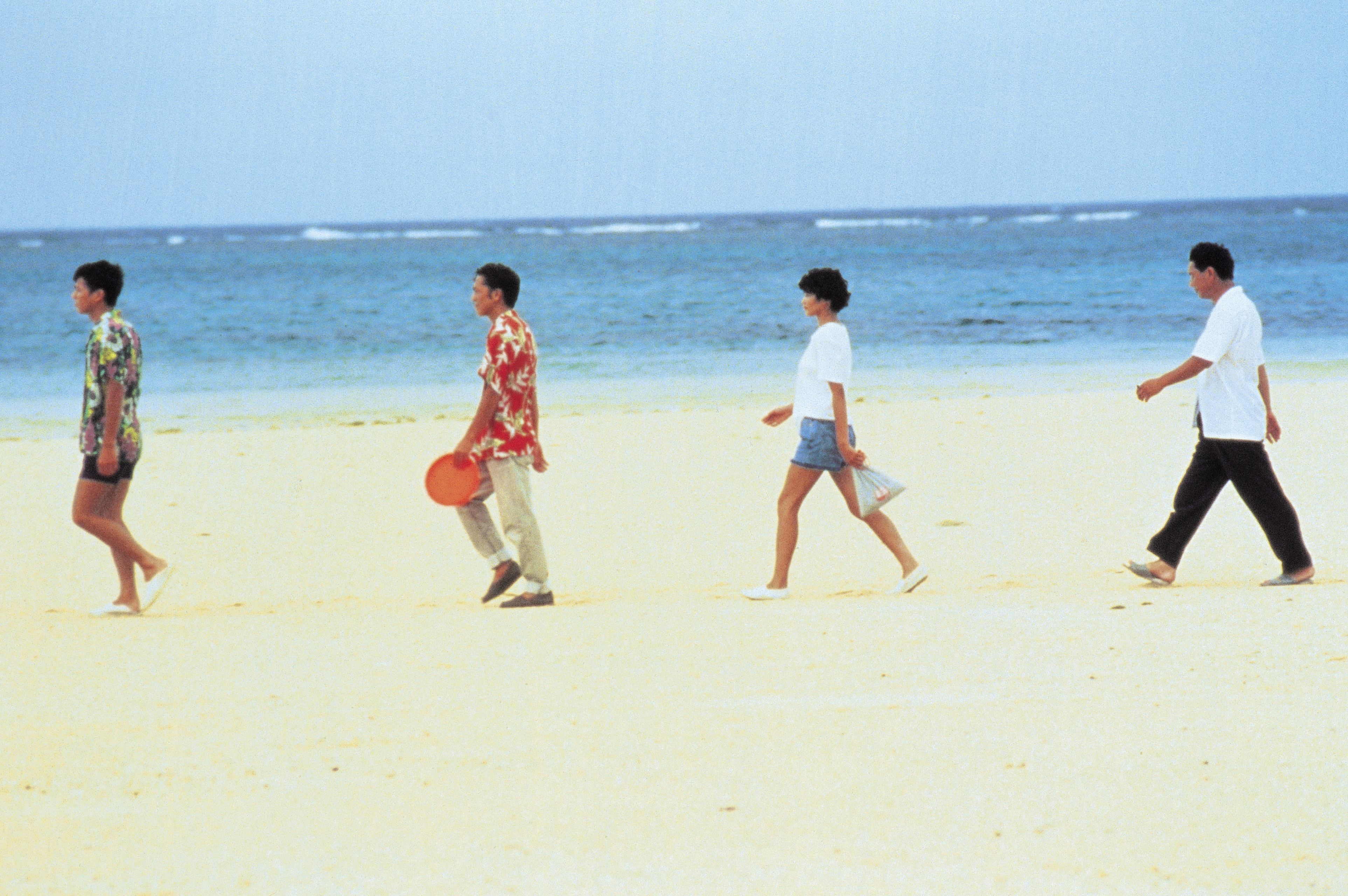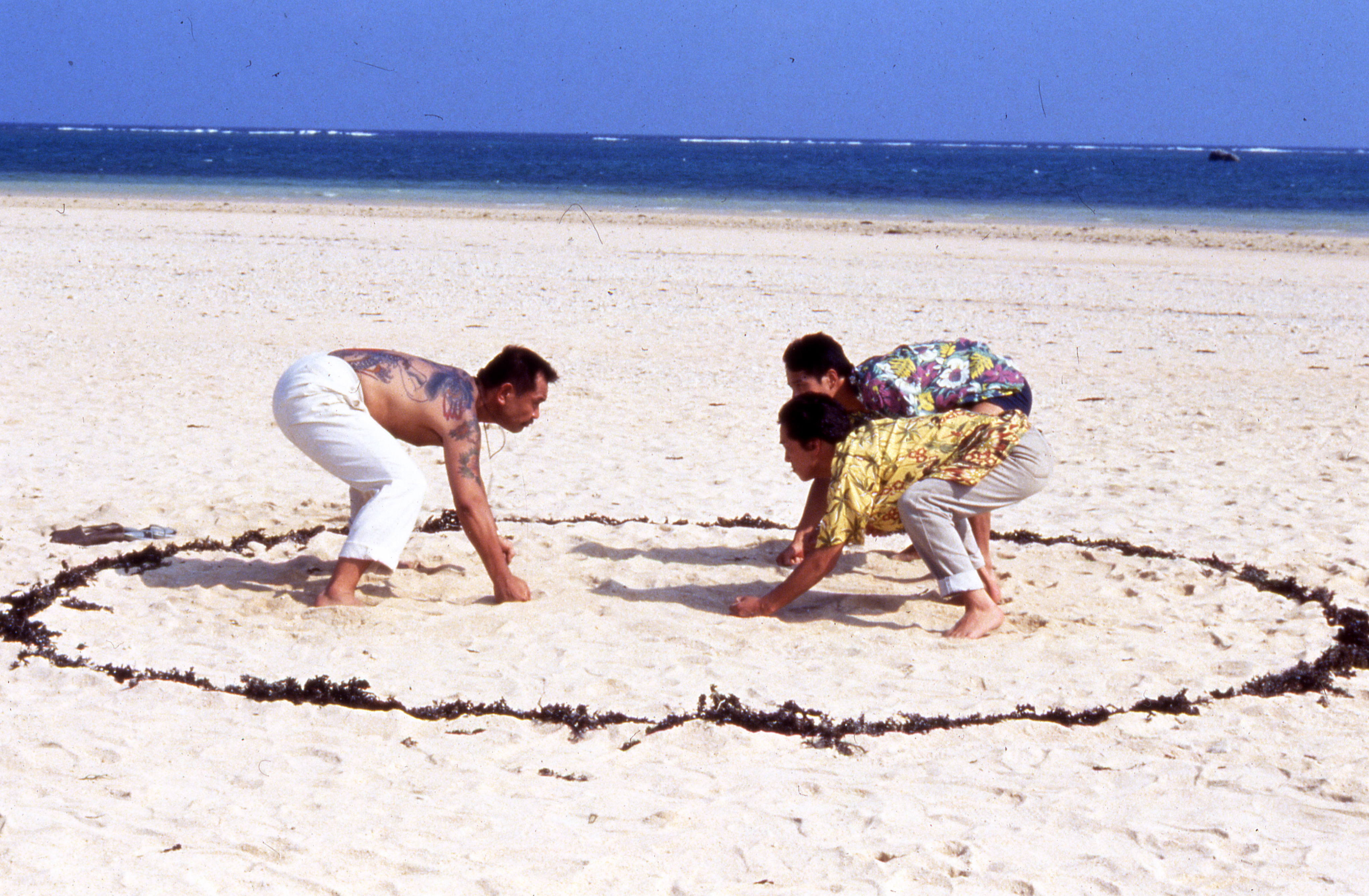 Although Sonatine is a yakuza film, it defies the conventions of the genre. Takeshi Kitano offers no shots of gambling houses or dingy back rooms, nor of streets lit up by neon lights at night. In this film, released in 1993, the gangsters swap their impeccably ironed suits for Hawaiian shirts and operate in an environment where nature reigns supreme: the tropical islands of Okinawa.