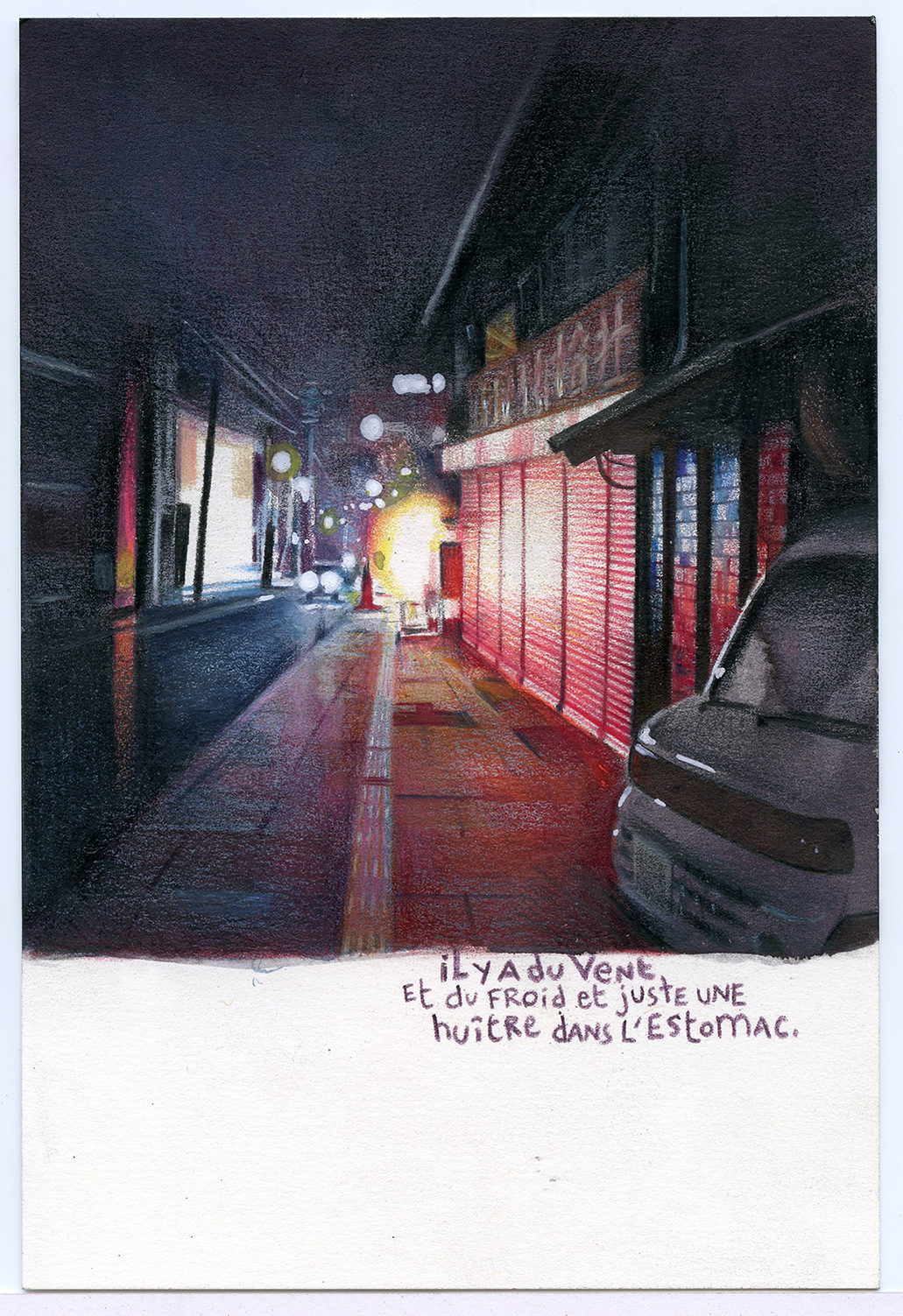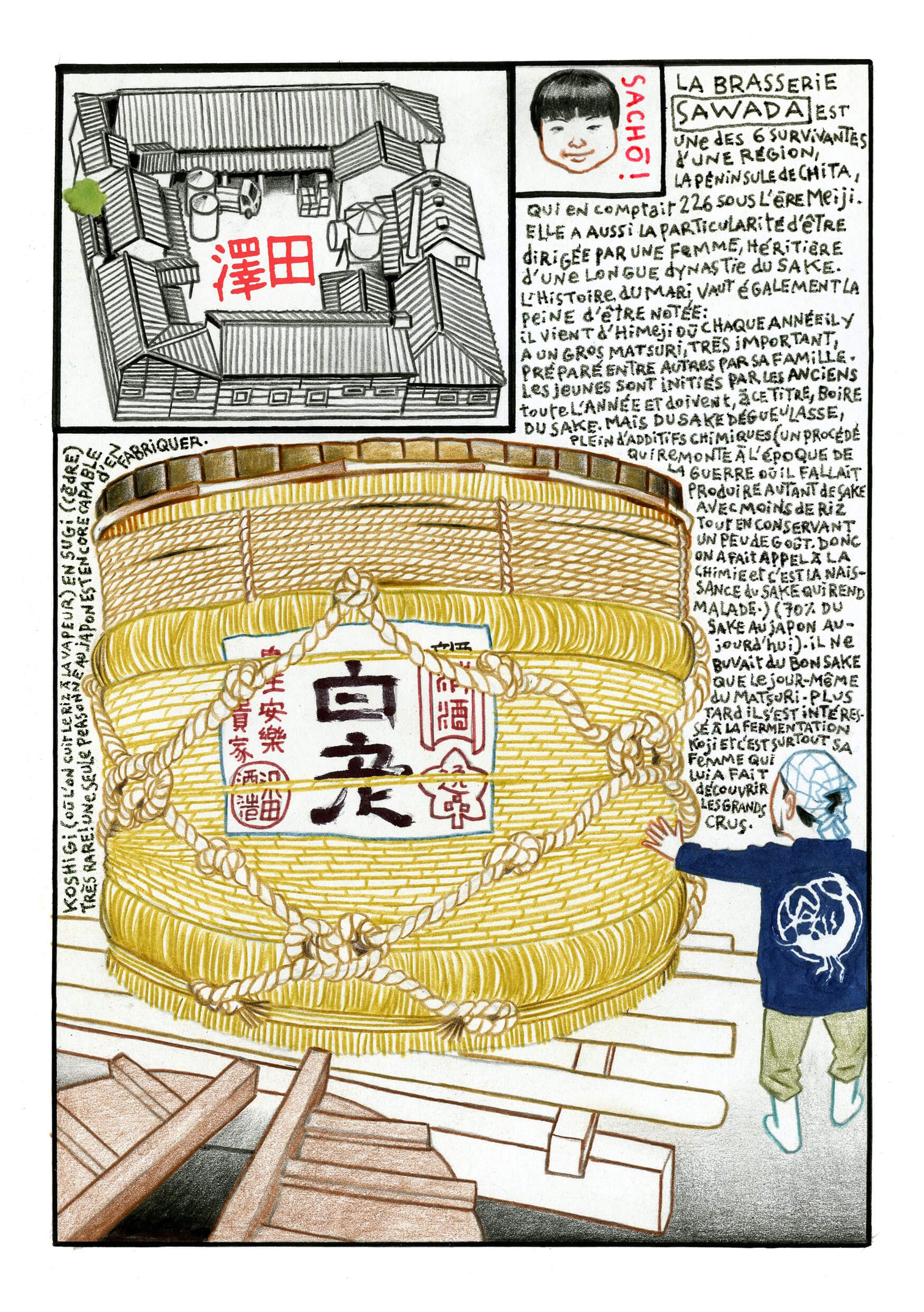 The reader follows the journey of Florent Chavouet and his companions in Tokyo and then on the Tokaido road, on the trail of this iconic Japanese alcohol, depicted over the pages in coloured pencils and watercolour ink by the illustrator. The educational pages that teach the reader about the subtleties of rice alcohol are accompanied by sketches of what caught Florent Chavouet’s keen eye. To create this book, he spent a month and a half in Japan, broken up by a return trip to Strasbourg for a few weeks, before discovering Hokkaido and its harsh winter.