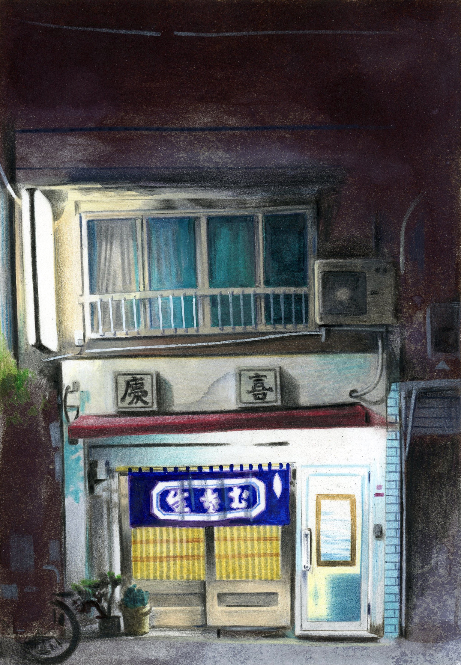 Unusually shaped houses, the poetry of the chiaroscuro effect of frosted glass windows, children’s games, or a kettle illuminating the night with its blue light, everything is subject to poetic treatment in the precise lines drawn by this artist, who still considers himself a tourist in Japan. ‘I don’t live in Japan so I’m still surprised by people, by situations, by visual details. I’m much more alert visually than I can be in France’, concludes Florent Chavouet.