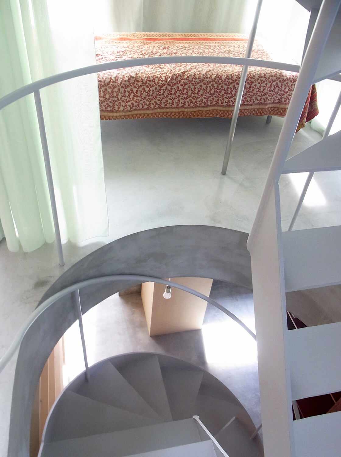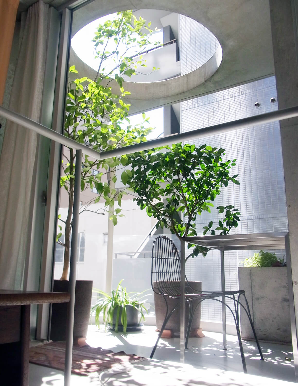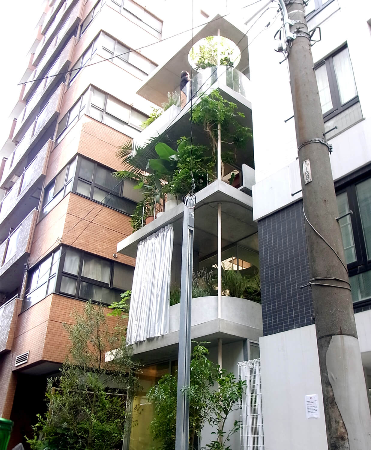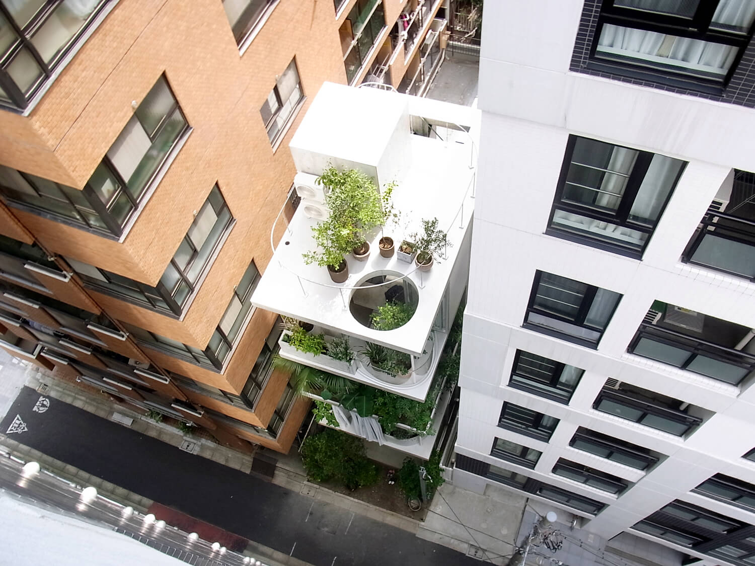 It is situated on an area of land just four metres wide, between two large buildings. To optimise the space, the architect designed a wall-less house. ‘The entirety is a wall-less building designed to provide an environment with maximum sunlight despite the dark site conditions’, the architect explains to magazine Dezeen. Each room has curtains, as well as plants and a small garden of its own to shield it from prying eyes.
