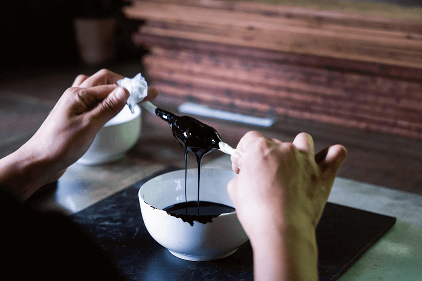All lacquer work is handled by Ai. Seated at her desk, she works alone and in silence, carrying out each gesture with steady focus. Between steps, glimpses of the greenery surrounding the atelier, caught in passing, gently ease the mind.