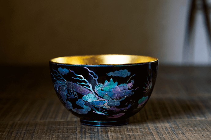 Alongside the understated bowls she creates for Mokushikkō Tokeshi, Ai has recently been working on recreations of pieces from the Ryūkyū lacquer tradition. Pictured here is a ‘kuro-urushi unryū raden’ bowl.