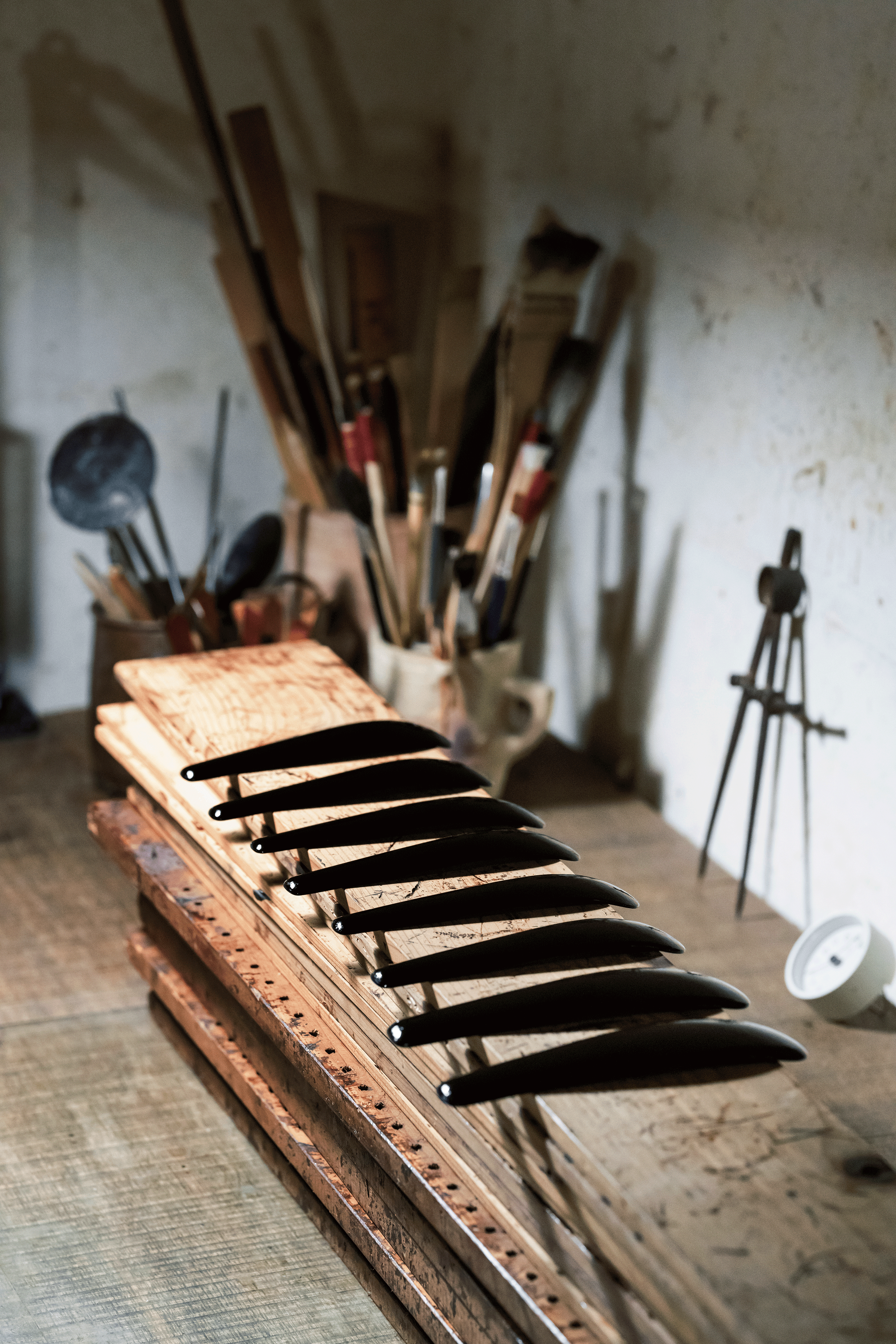 Spoon-shaped spatulas set aside while the lacquer dries. As it absorbs oxygen from the air, lacquer hardens slowly. Allowing time—patiently—for this process to unfold is fundamental to lacquerware making, ensuring pieces that are both structurally sound and impeccably smooth in finish.