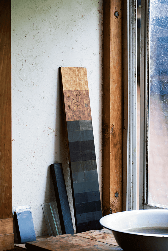 Samples illustrating the various stages of the process, from preparing the base to applying the final coats. Adjusting the lacquer in multiple ways according to the condition of the material and its intended use is one of the defining characteristics of Mokushikkō Tokeshi.
