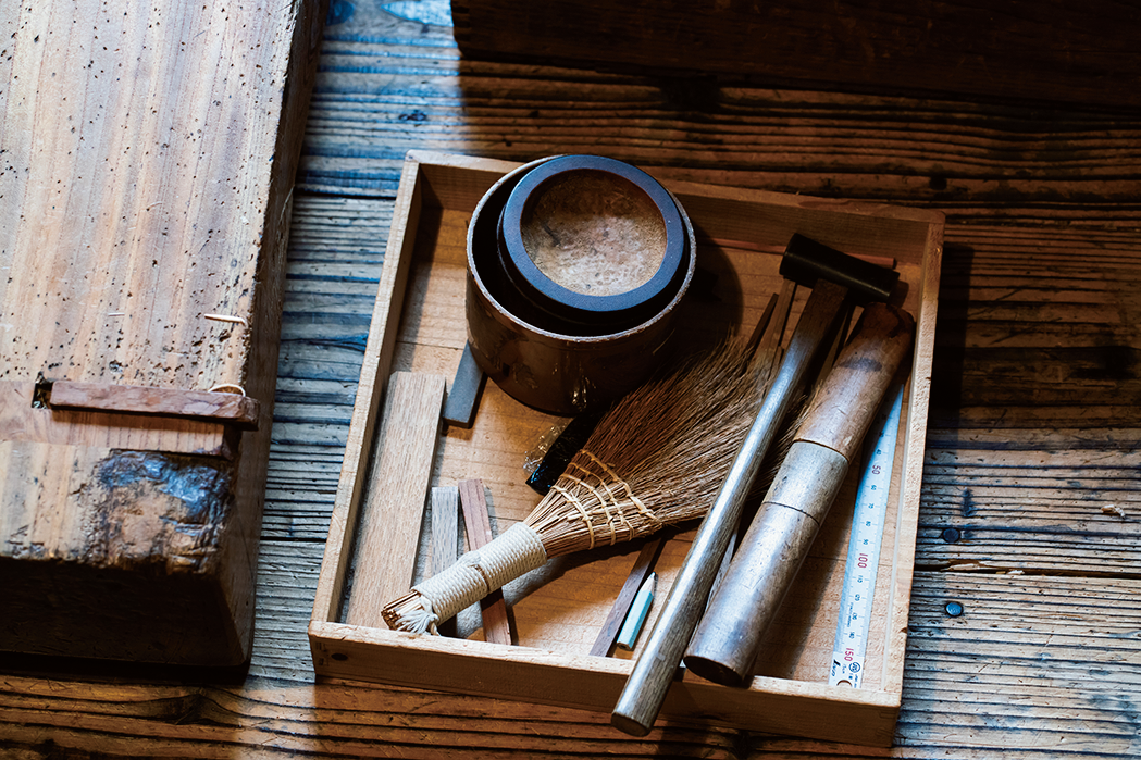 Seated directly on the floor with his legs crossed, Hiroyuki Tokeshi carries out the final finishing work. ‘Rather than sitting on a chair, this position allows me to move my knees freely. The body is more stable, and it’s easier to control force.’