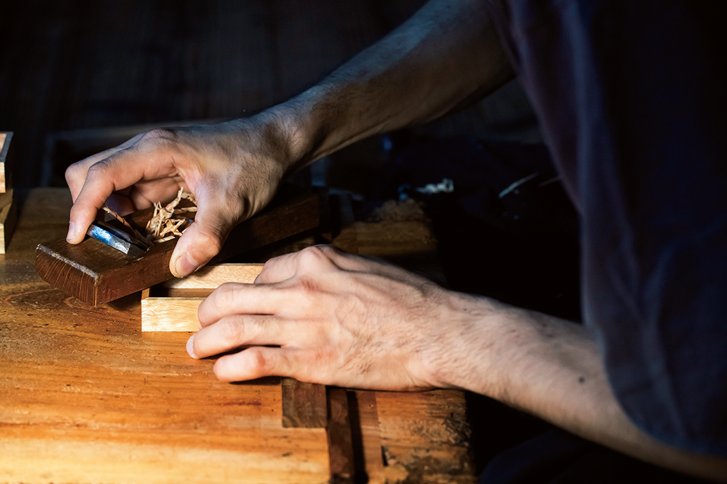 Feeling the surface of the wood with the fingertips of his left hand, he slowly guides the plane, carefully refining the edges of the boxes.
