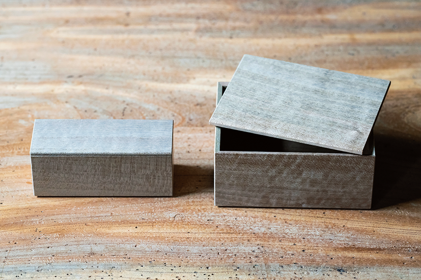 Other works by Nakayama Mokkō. At right, a key case in ‘hamasendan’, ¥8,800; at left, a cotton-swab container in ‘hamasendan’, ¥6,600.