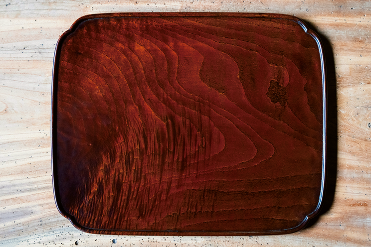 Alongside his work as a craftsman, Hiroyuki Tokeshi also pursues a more personal, creative practice. For this inward-angled tray in ‘hamasendan’, he applies the ‘fuki-urushi’ (wipe-lacquer) finish himself.