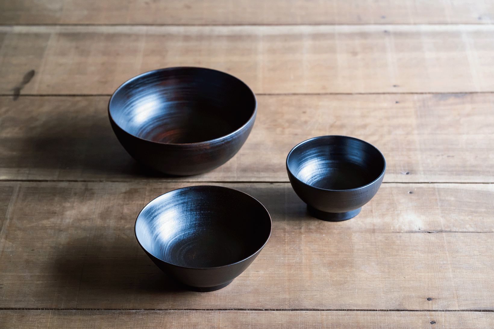 Bowls with an expansive, fluid silhouette, their distinctive forms settling naturally into the hand when lifted. At right, a flared-rim bowl in ‘iju’, ¥22,000; at left, a children’s bowl in camphor wood (tall), ¥14,300.