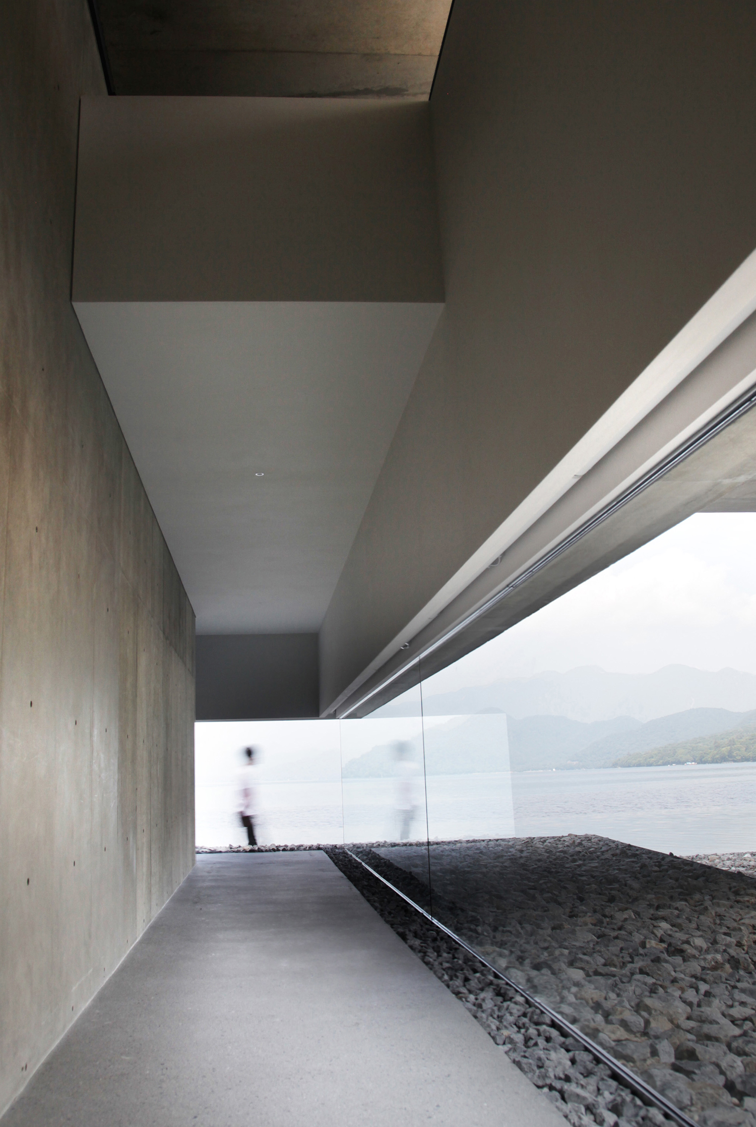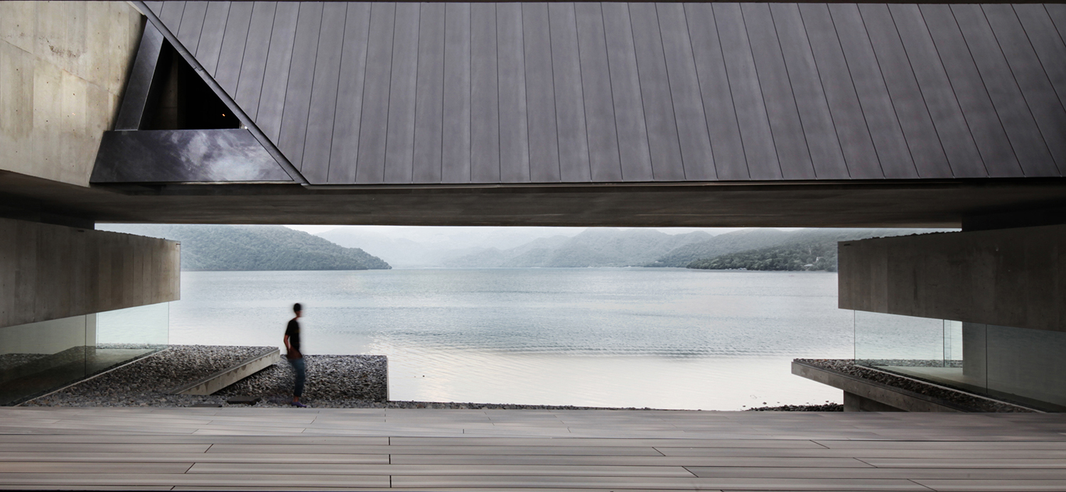 The building covers 640 square metres and stands at the top of a slope roughly seven metres high, which descends from the coastal path to the lake. To avoid having too large an impact on the naturalness of the place and to preserve the unique character of this remote environment, the architects decided that rather than raising the ground level, they would place the building down very low, almost at the level of Chuzenji-ko. Thanks to the building’s spiral shape, the distance between its inhabitants and the water, the reflection of the lake, and the humidity and the temperature are constantly evolving and offering a new experience every time.
