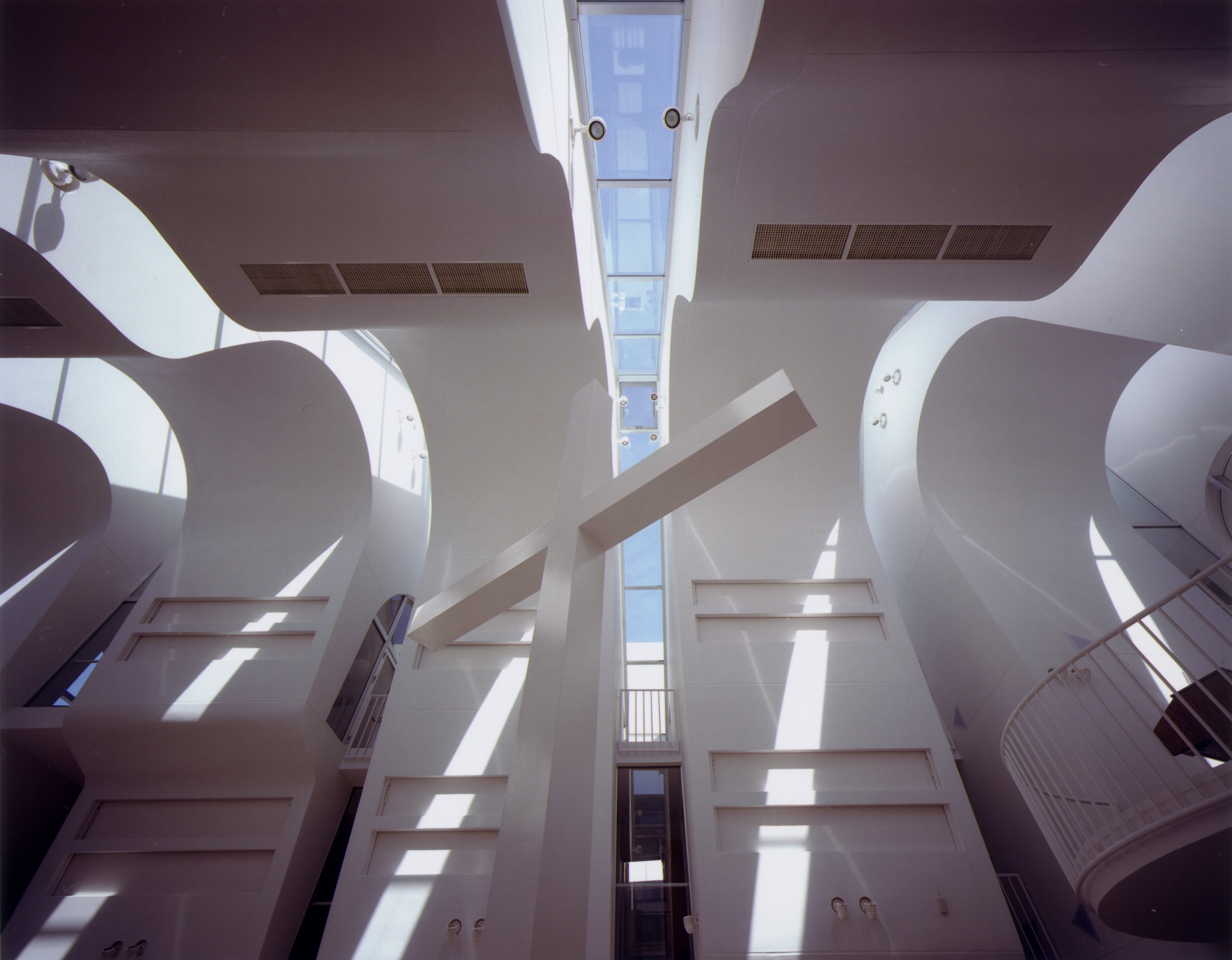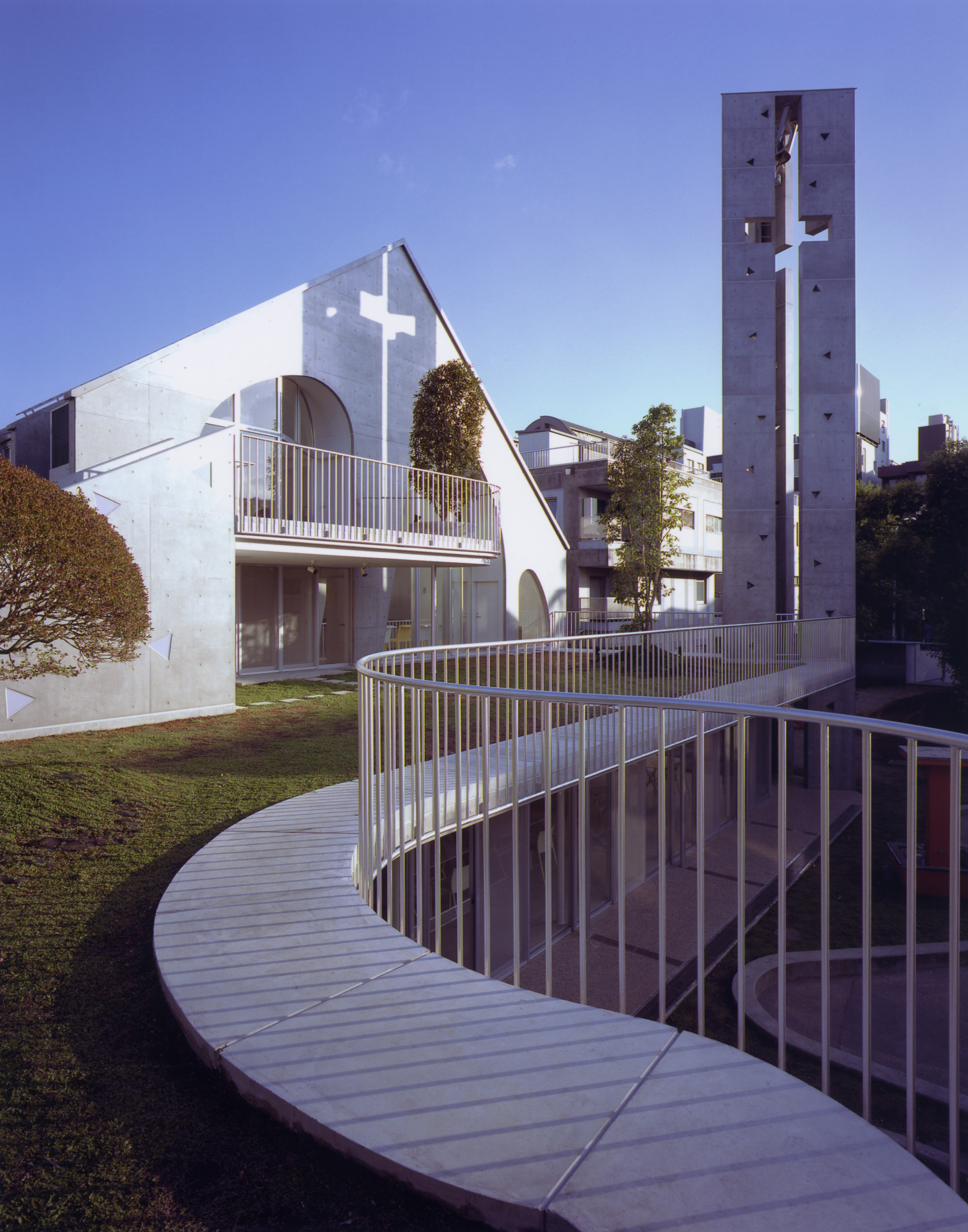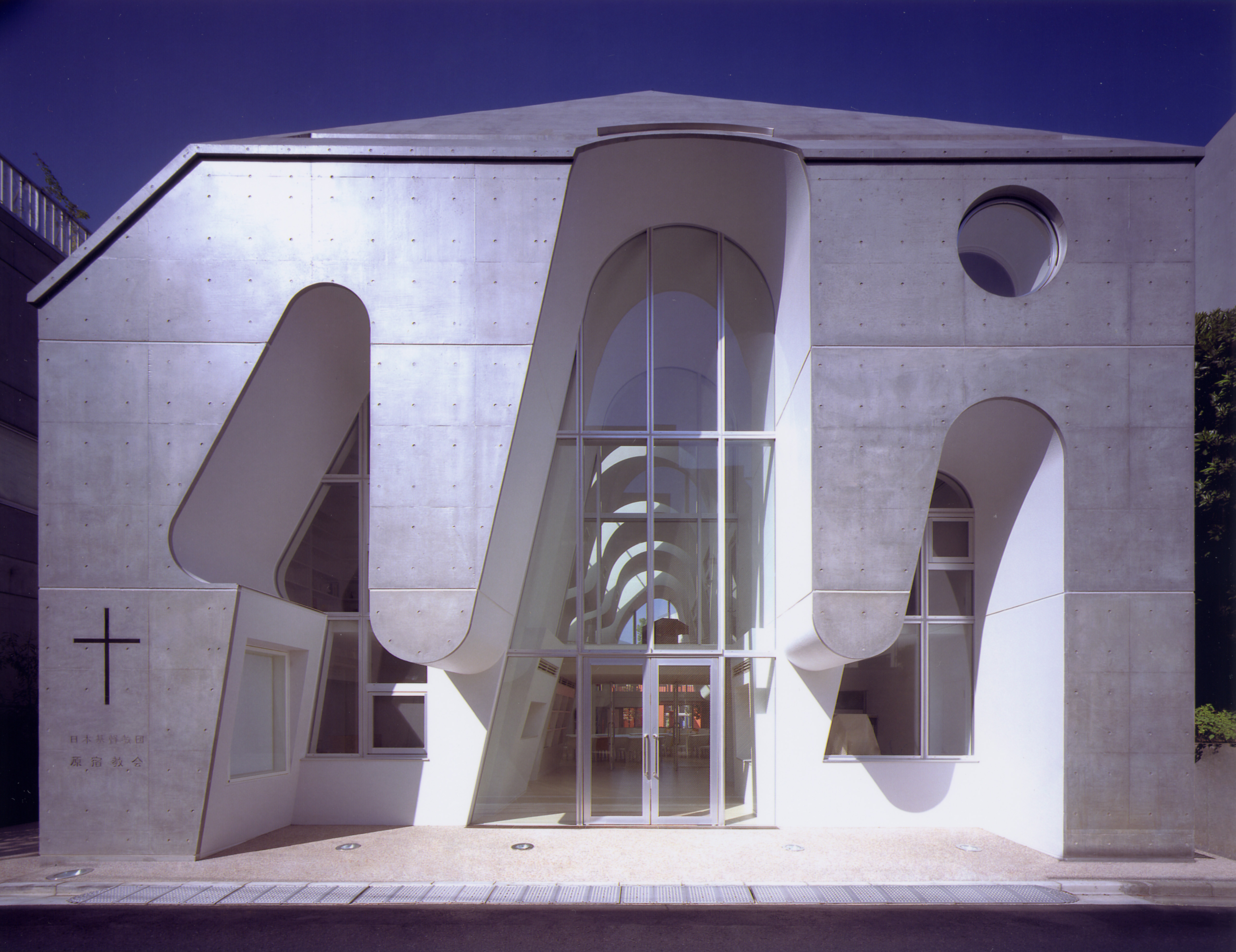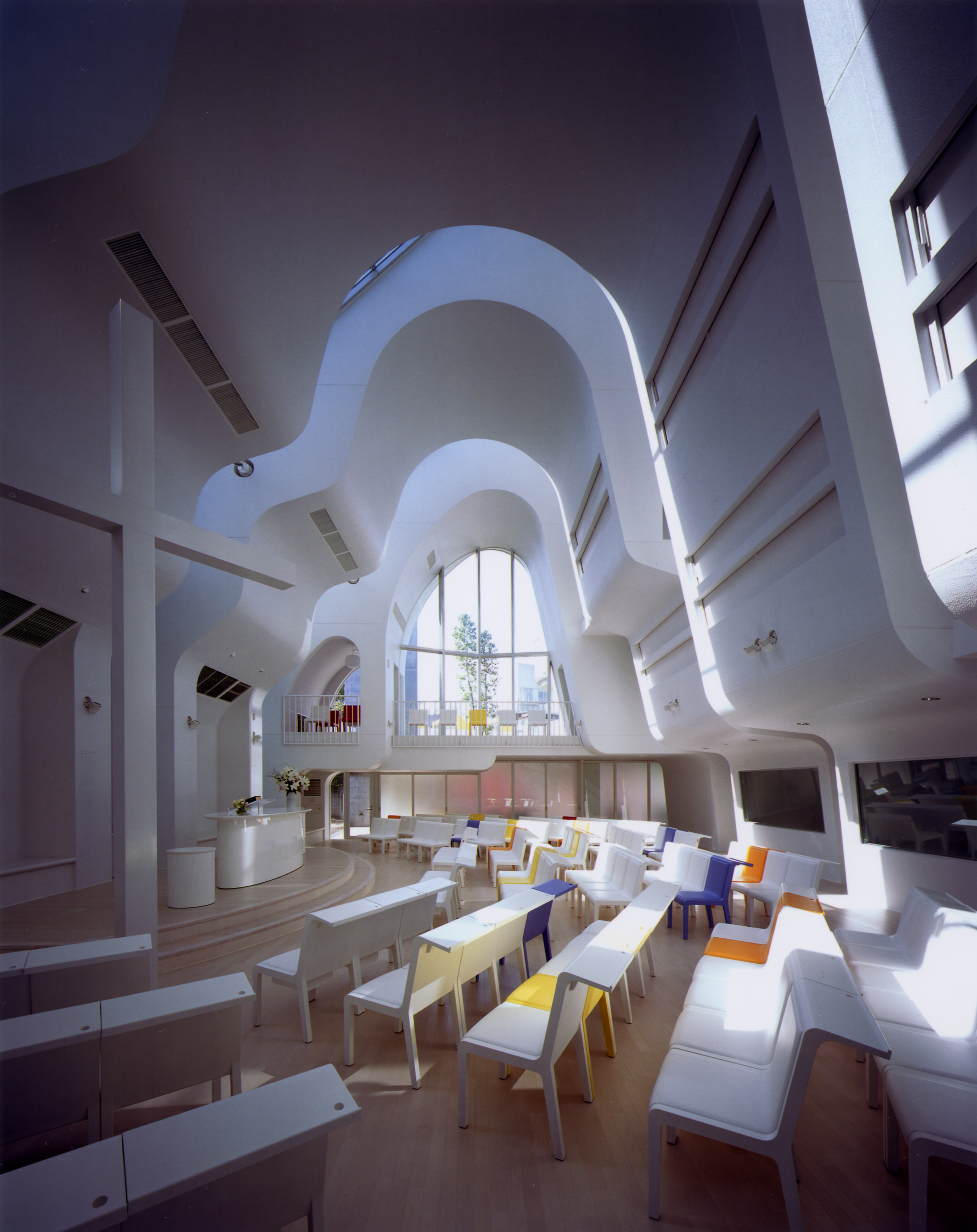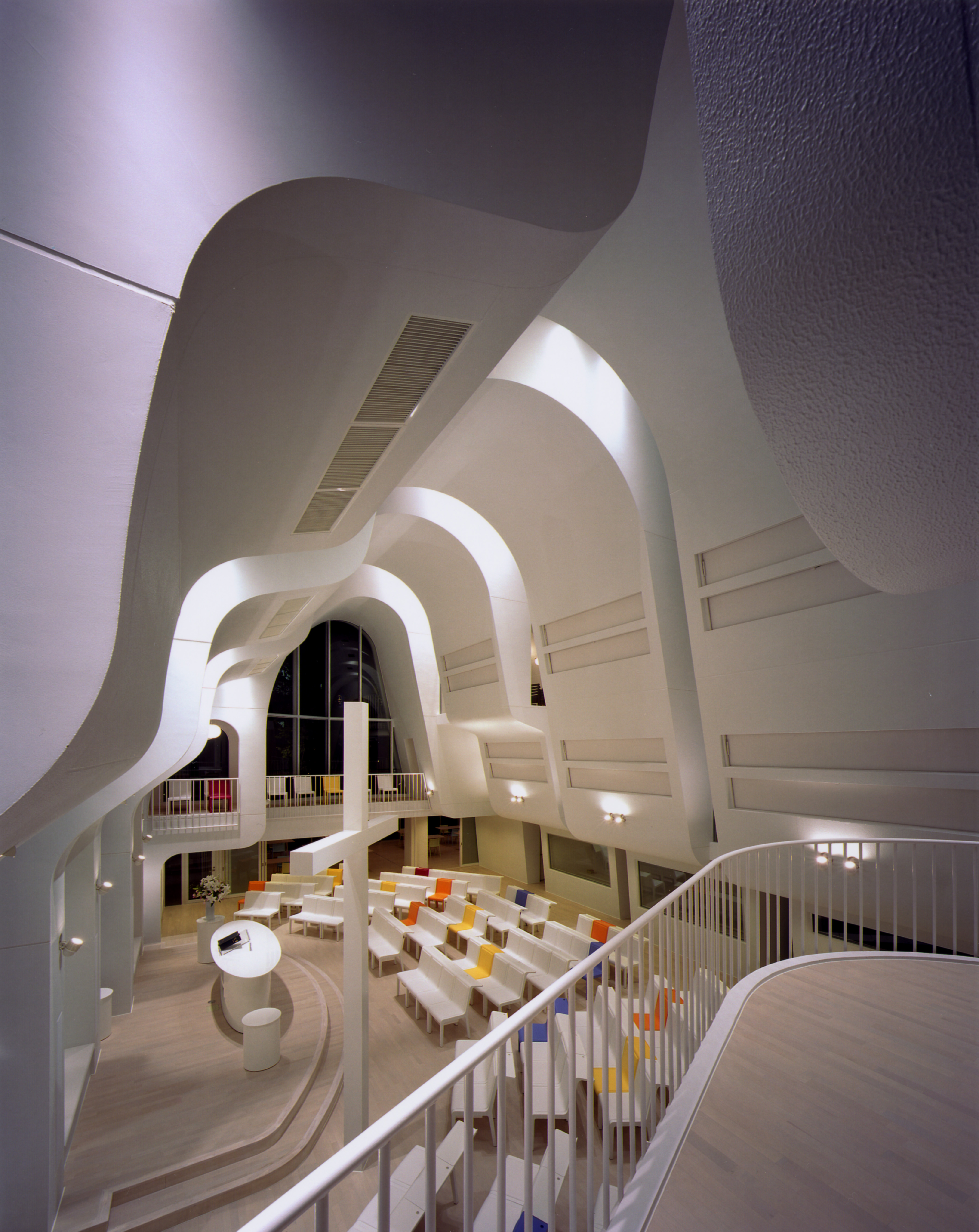 Constructed in 2007 in the heart of Tokyo’s lively Harajuku district by architectural firm Ciel Rouge, this protestant temple contains various surprises. Its façade, made entirely from rough concrete—reminiscent of Tadao Ando’s creations—and its angular lines contrast with the completely curved design found upon entering.