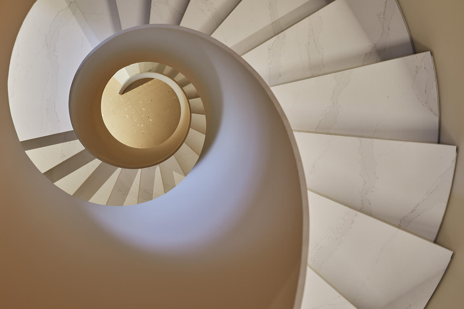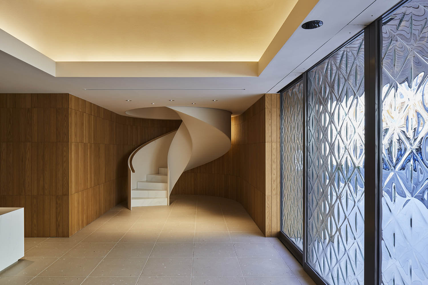 The elegant spiral staircase, the shape of which is reminiscent of that of a shell, connects the different levels. This strong move echoes the work of other Japanese architectural firms who have also made stairs a central element in their work, like Stairway House by design studio Nendo.