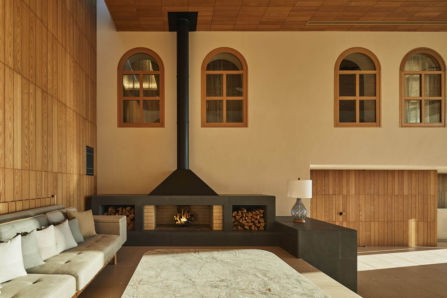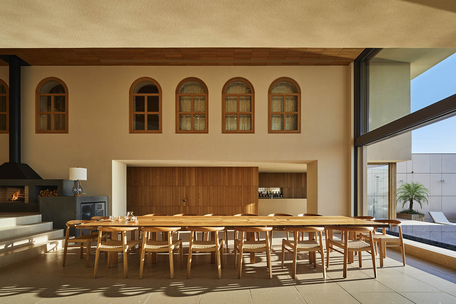 On this side of the building, five-metre-wide vertical, power-operated windows disappear, once open, into a frame, to give the impression that the building is completely open to the sea. Its three floors, one of which is a basement, have been decorated in natural, warm tones, with wooden flooring upstairs and terrazzo flooring on the ground floor, considered by the architects as the best way to replicate ‘the soft texture of the beach and an overall beach-like sensation’ inside.