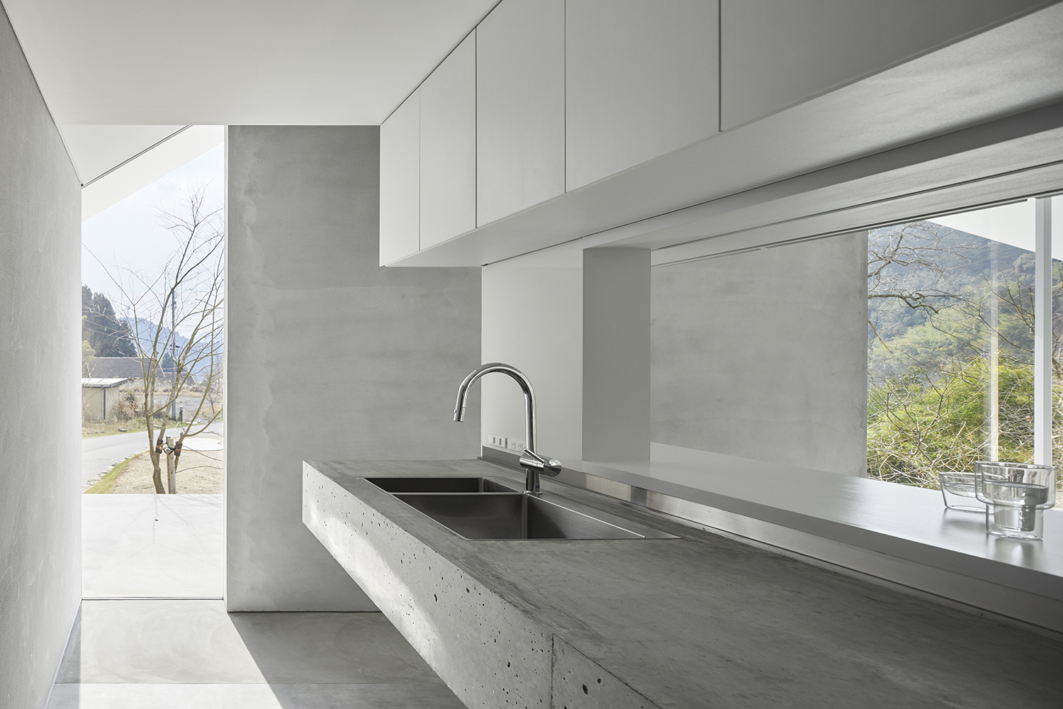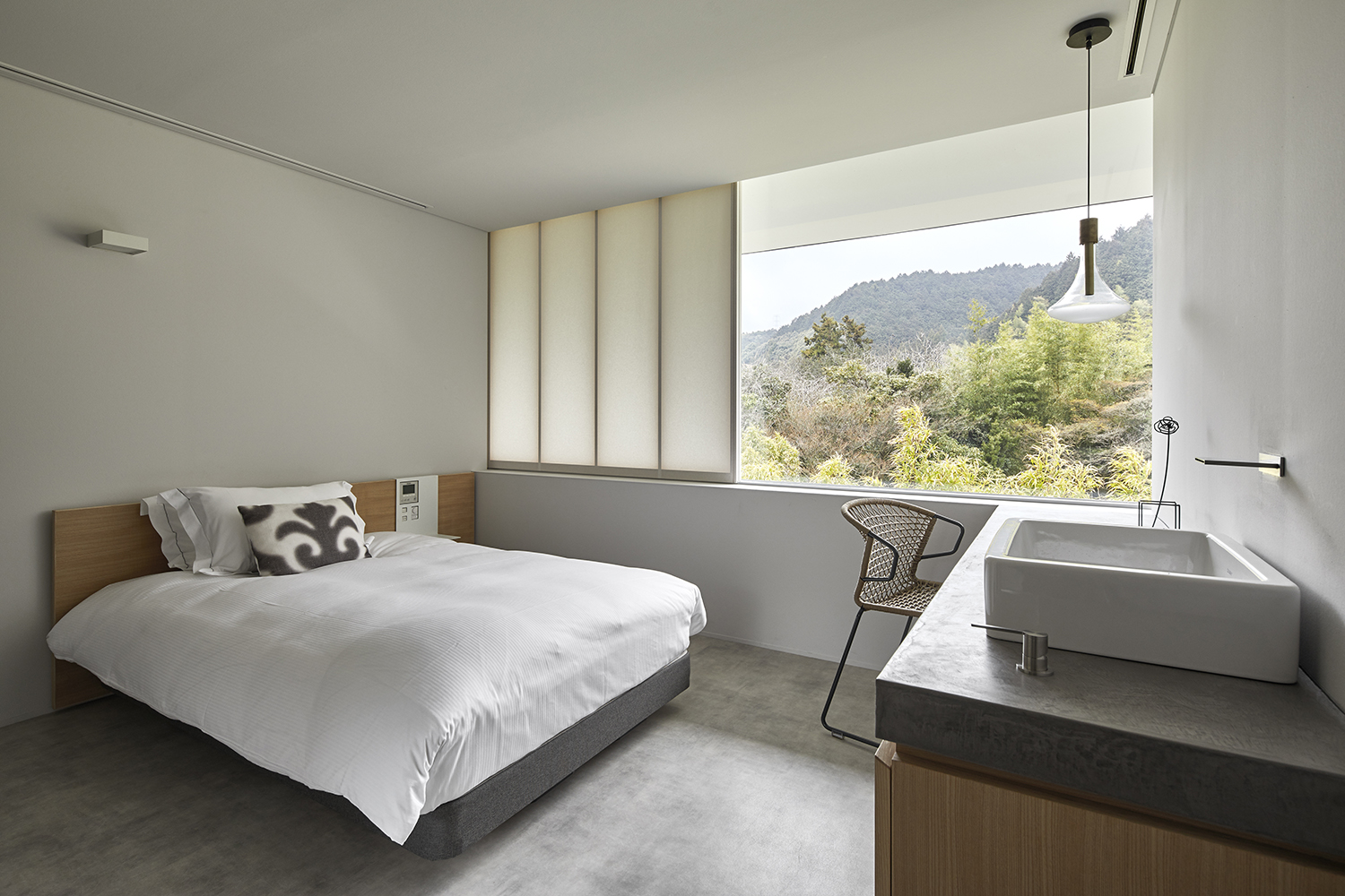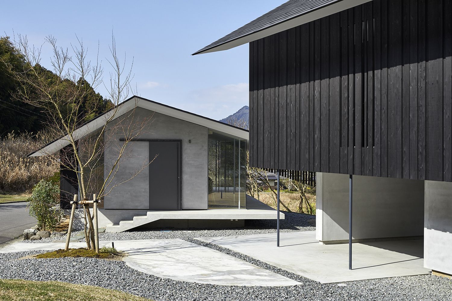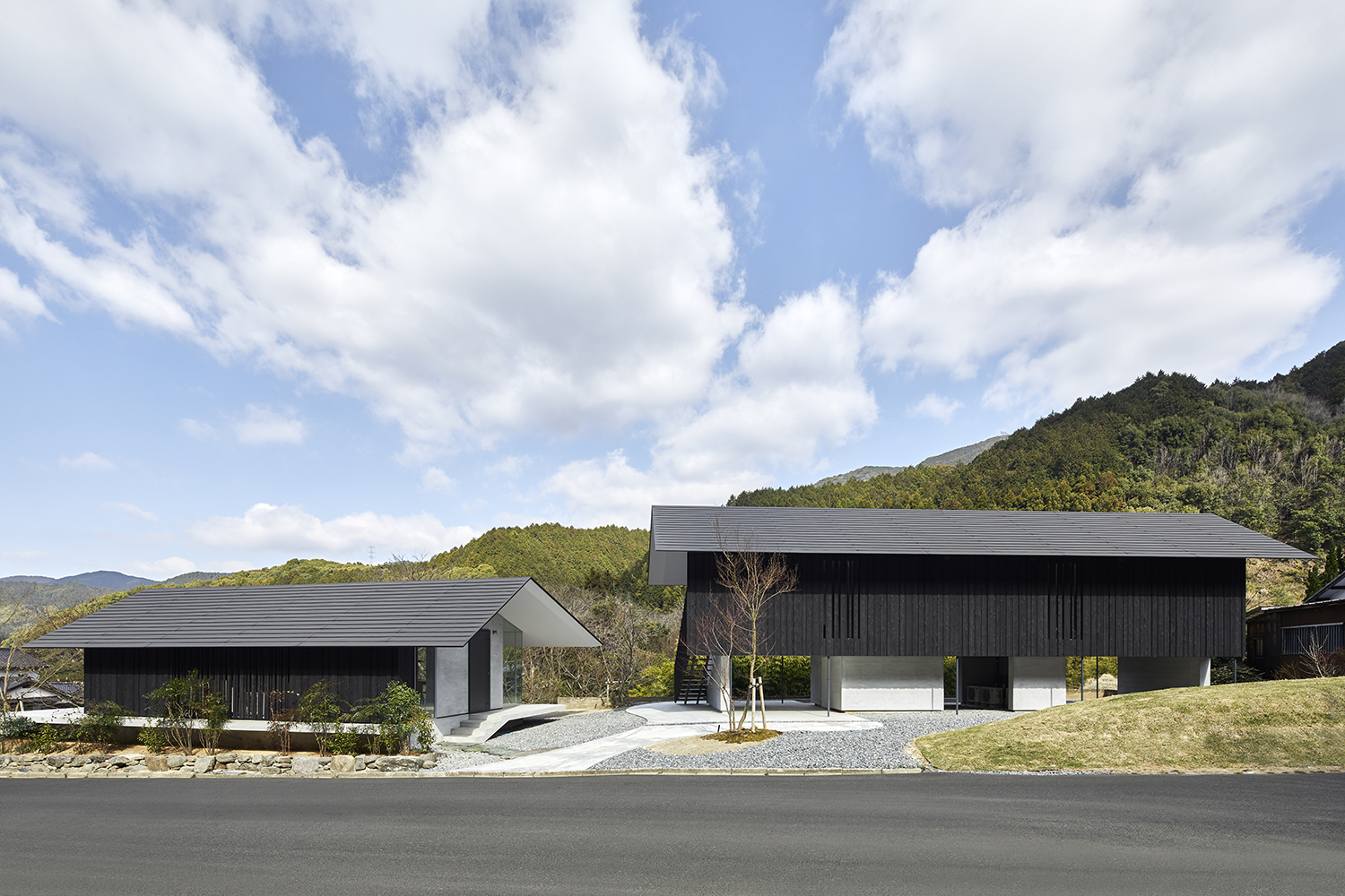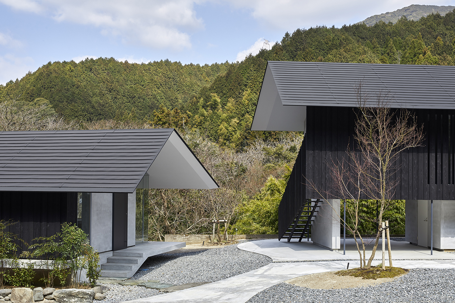 The outer walls with timber cladding are painted black to blend in with the landscape. The inside of the building also combines tradition and design: wood and minimalism predominate, but the cleanliness of the lines is supported by the raw aesthetic of the concrete and the hand-plastered floor, combined with black sumi ink. ‘This balance is to avoid things being static, while preserving the humility of the intentions behind the project’, concludes Teppei Fujiwara.