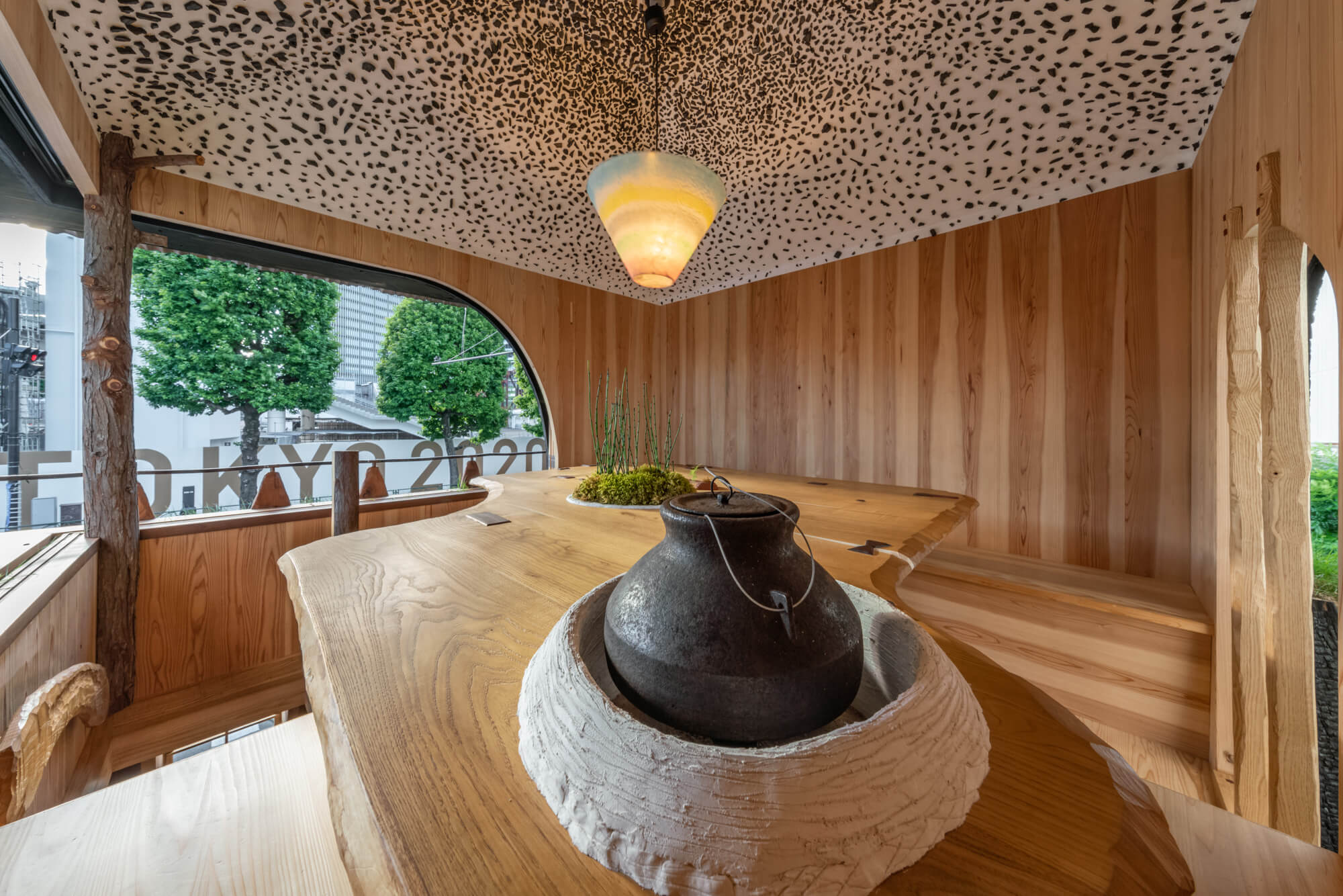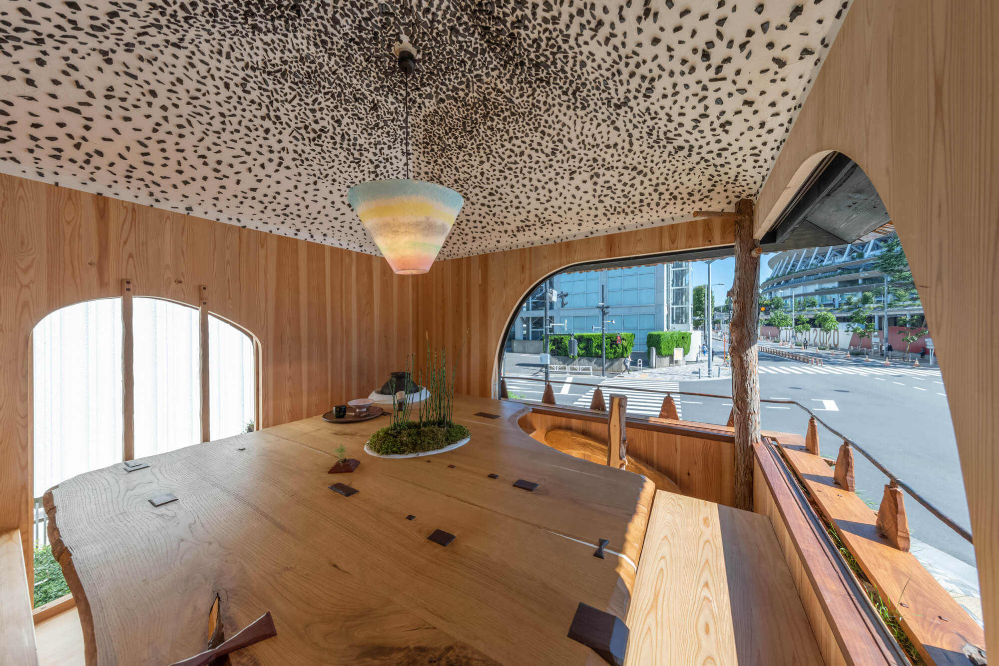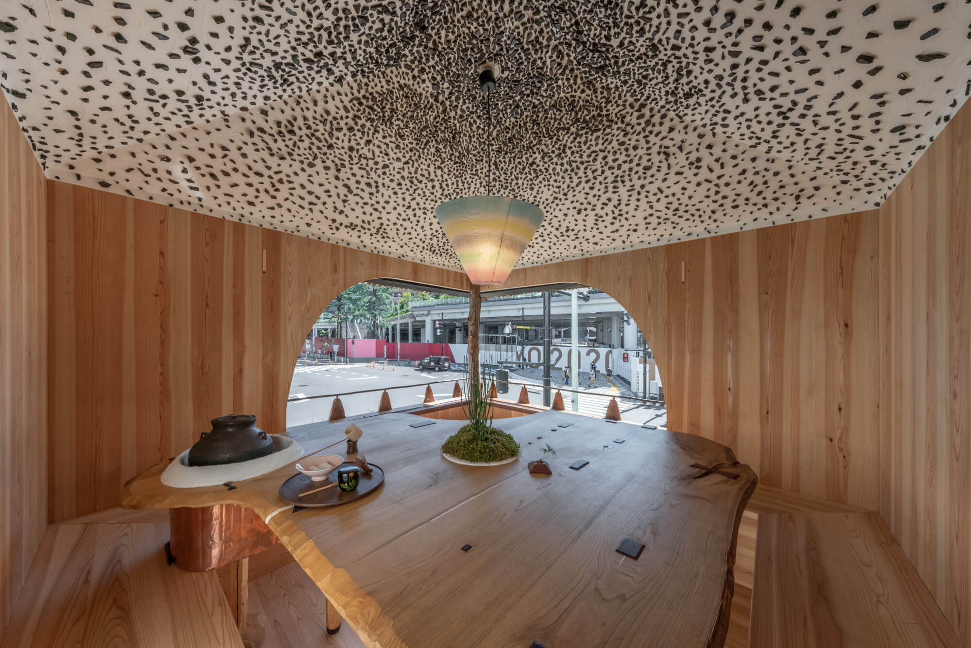 To enter Go-an, visitors need to go through one of the little doors found on the side of the building, and then climb a few rungs of a ladder that will take them into the heart of the tea salon, in the middle of which stands a large table made from chestnut boards from Nagano prefecture. The space is bathed in light thanks to a large window, with the Olympic Stadium standing in the middle.